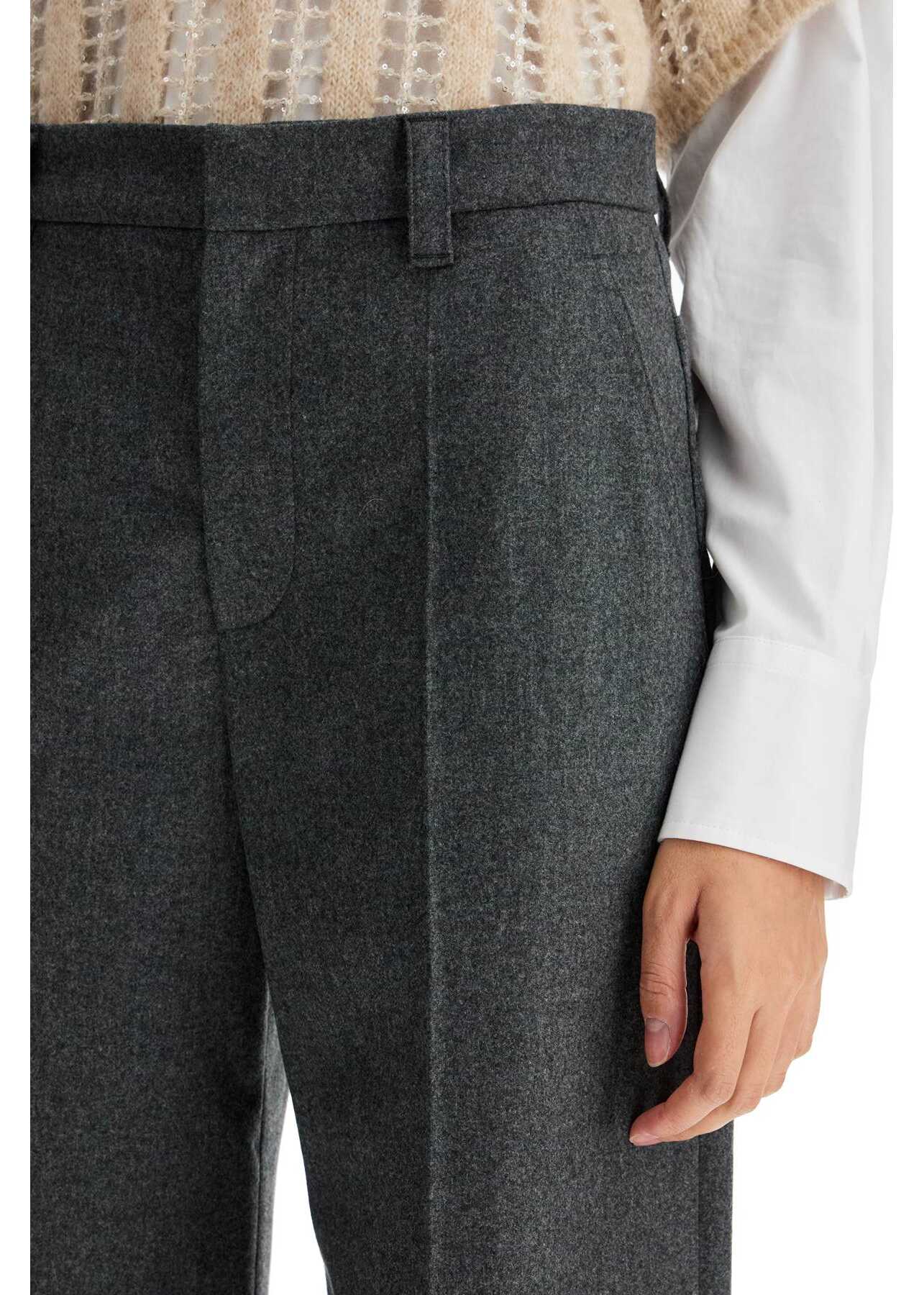 These Brunello Cucinelli pants are made of soft wool and cashmere flannel with a mélange effect, featuring a wide tailored cut enhanced by a pressed crease. They have a hidden zip and hook closure, side French pockets, and patch back pockets. The design is completed by belt loops at the waist and the signature monile on the back. The model is 177 cm tall and wears an IT size 38.