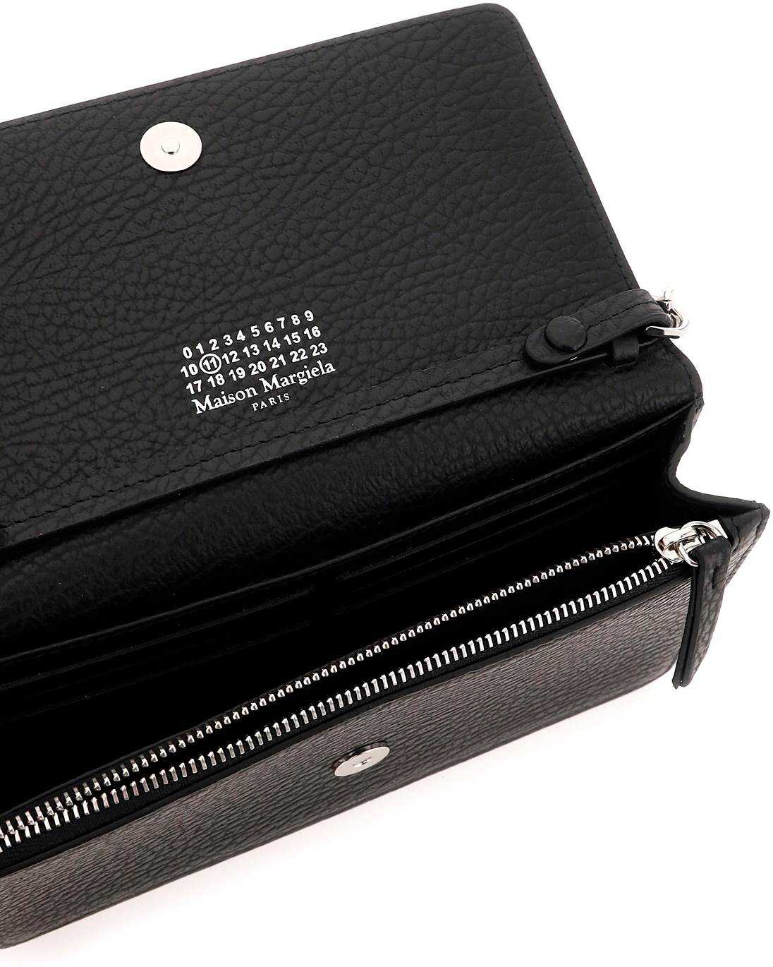 Maison Margiela mini bag crafted in grained leather with the iconic Four Stitches in white on the flap. Closed with a magnetic button, it features a leather and fabric interior organized in a large main compartment, one slip pocket, one zip pocket, and six card slots. A detachable chain shoulder strap with leather inset and a rear flat pocket complete the design. Silver finish metal hardware.