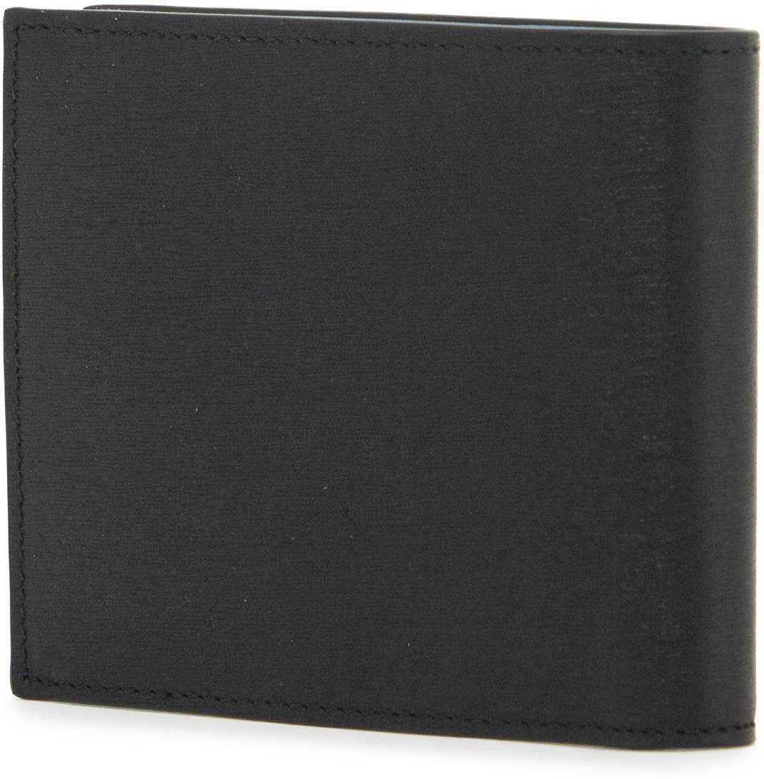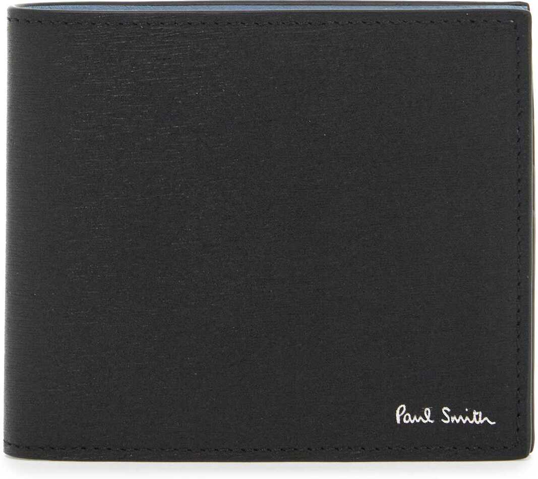 The Paul Smith wallet is made of saffiano leather with a color block interior. It features a compartment for bills, two slip pockets, and eight credit card slots.