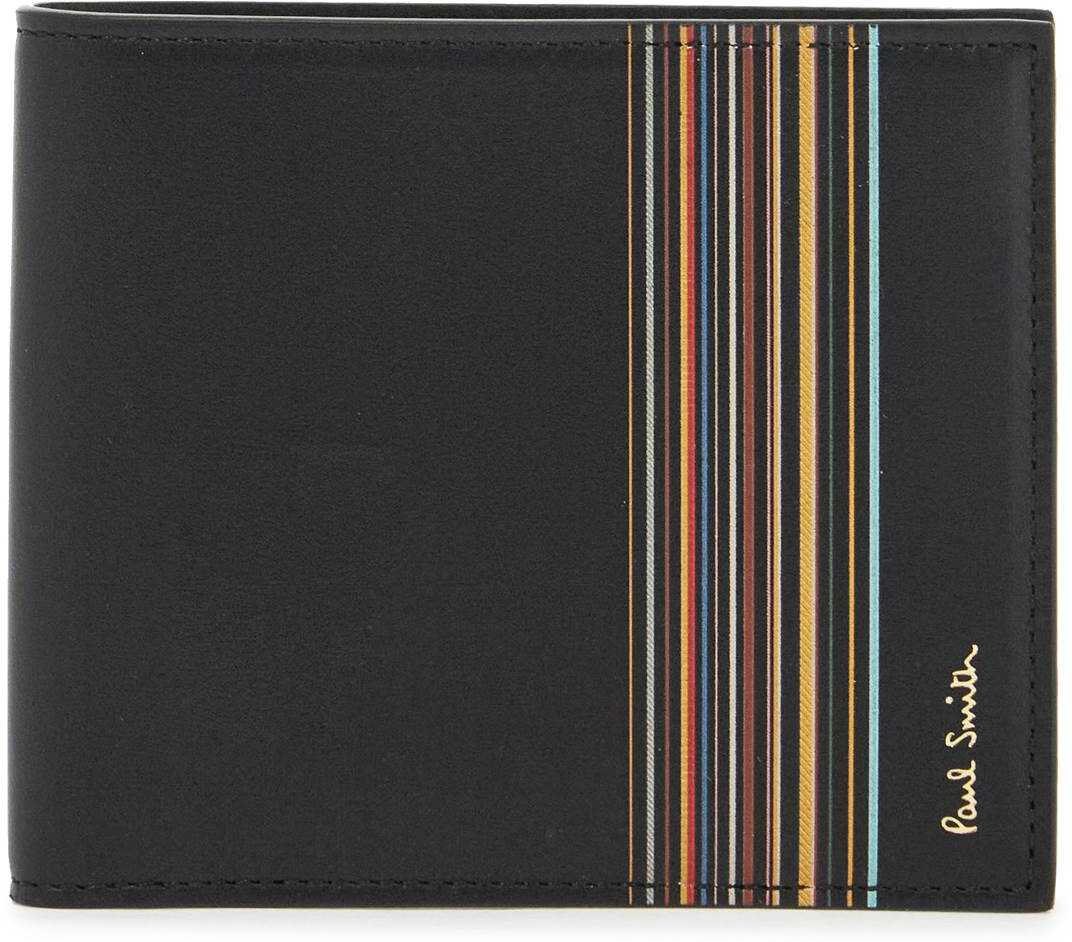 The Paul Smith bi-fold wallet is made of smooth leather with Signature Stripe Block detail and gold logo lettering. It features a compartment for bills, two slip pockets, and eight credit card slots.