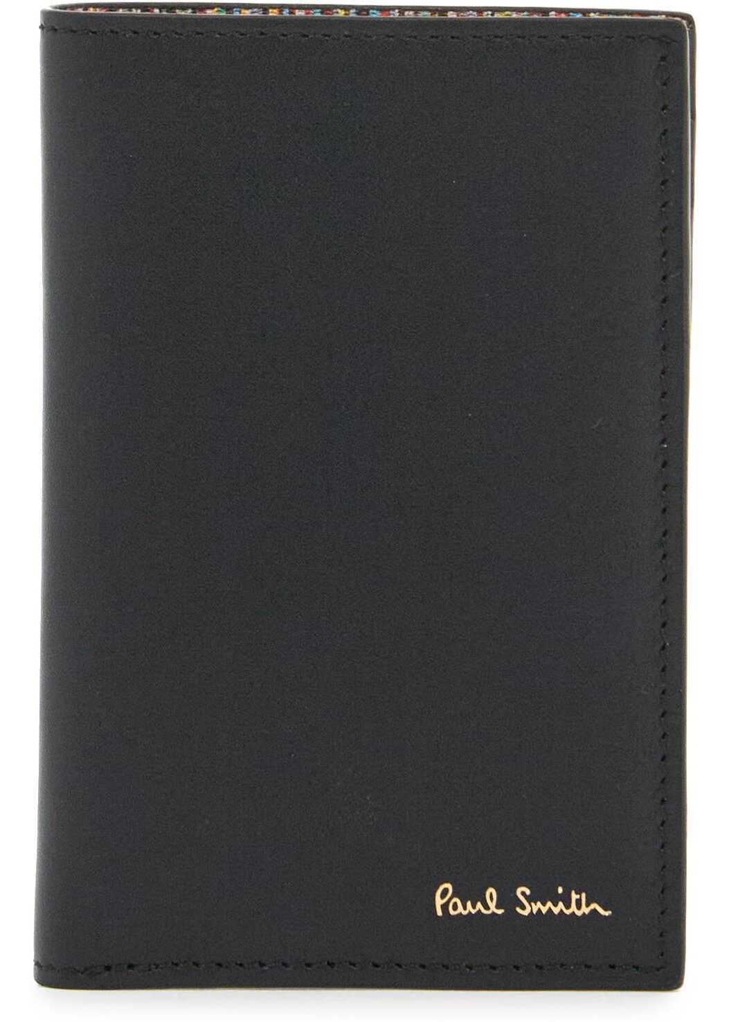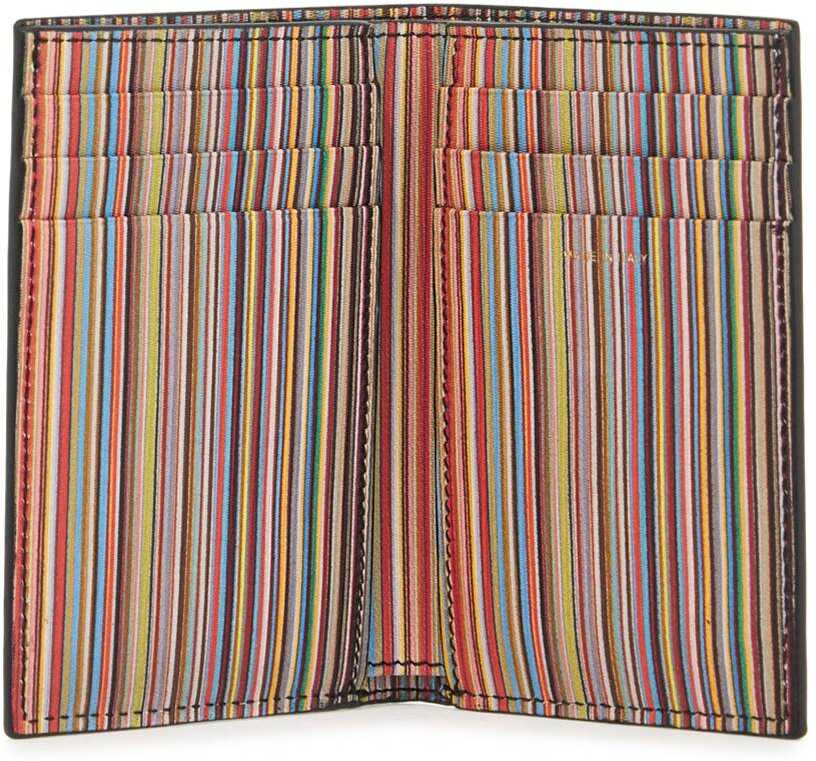 The Paul Smith leather credit card holder features a gold printed logo on the front and the iconic "Signature Stripe" fabric lining on the inside. It has one central pocket, two slip pockets for bills, and six card slots.