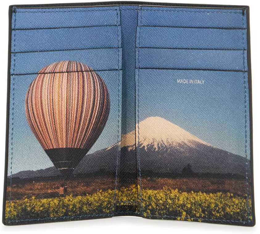 The Paul Smith wallet is made of saffiano leather with an interior decorated by the Signature Stripe Balloon print. It features a compartment for banknotes, two slip pockets, and six credit card slots.