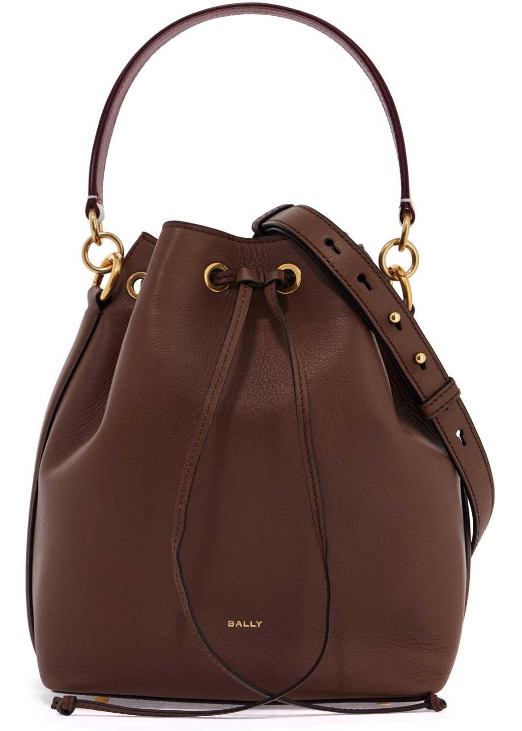 The Bally Code bucket bag is made of finely hammered leather with a drawstring closure and Bally Ribbon handle. The interior features a fabric lining with one zip pocket and an open pocket, protective feet at the base, and an adjustable and removable shoulder strap for a crossbody look. The metallic accessories have a gold finish.
