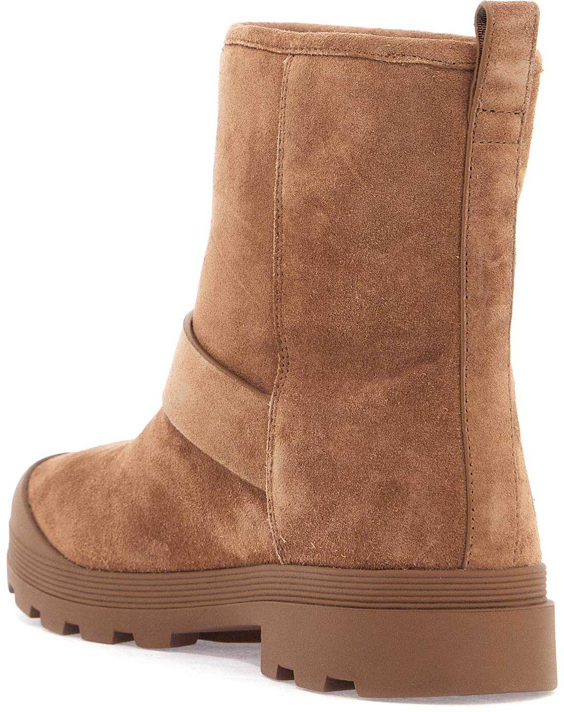 The Mellow ankle boots by Tory Burch are made of suede leather and adorned with the Double T buckle in golden metal. The interior is lined with shearling and the sole features a serrated rubber design.