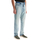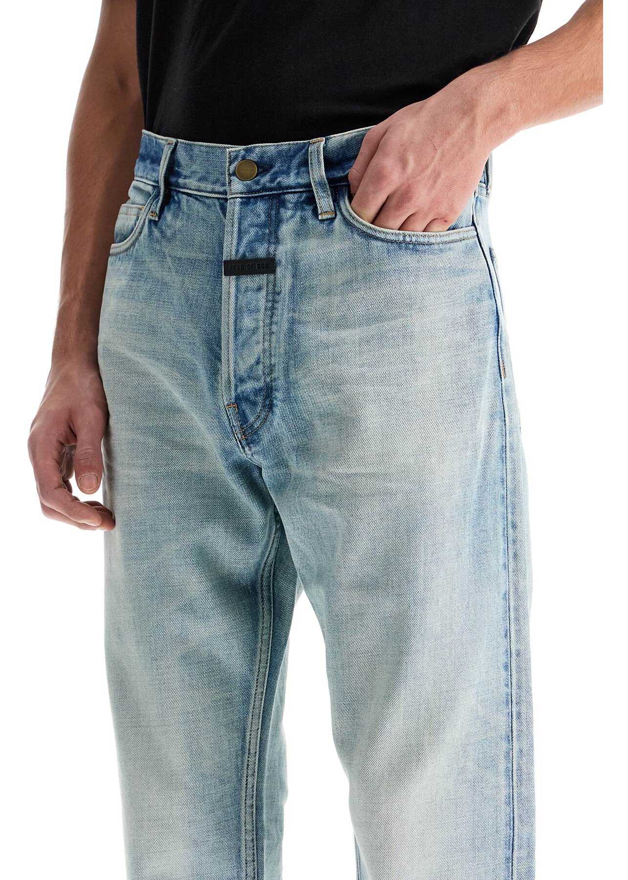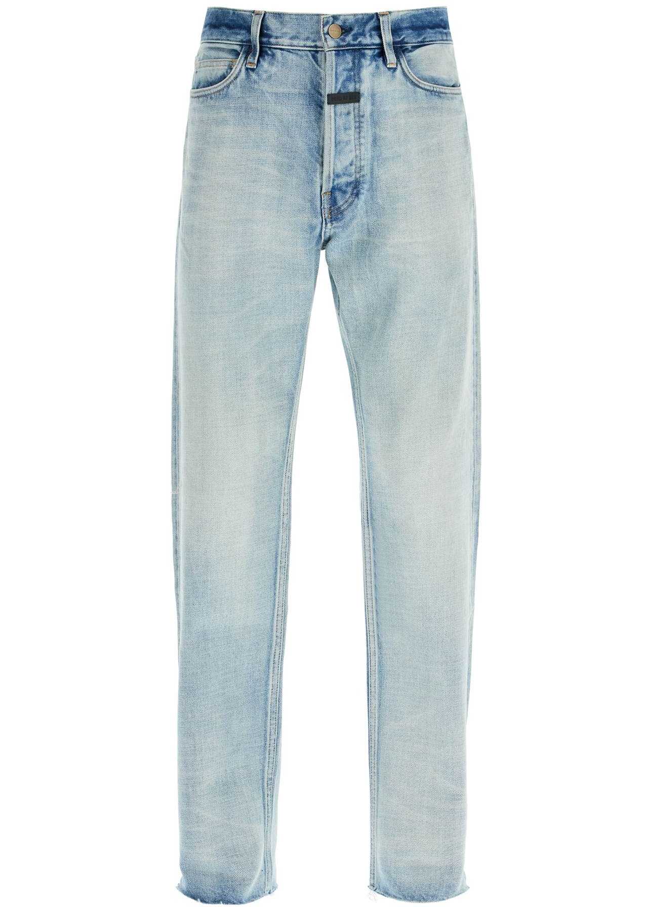 These Fear of God jeans are made from pure Japanese cotton denim with a light vintage wash. They feature a classic five-pocket design and have hidden button closure, belt loops at the waist, and a leather logo patch on the back. The straight leg has a frayed raw hem for added edge. The model is 182 cm tall and wears a size 31.