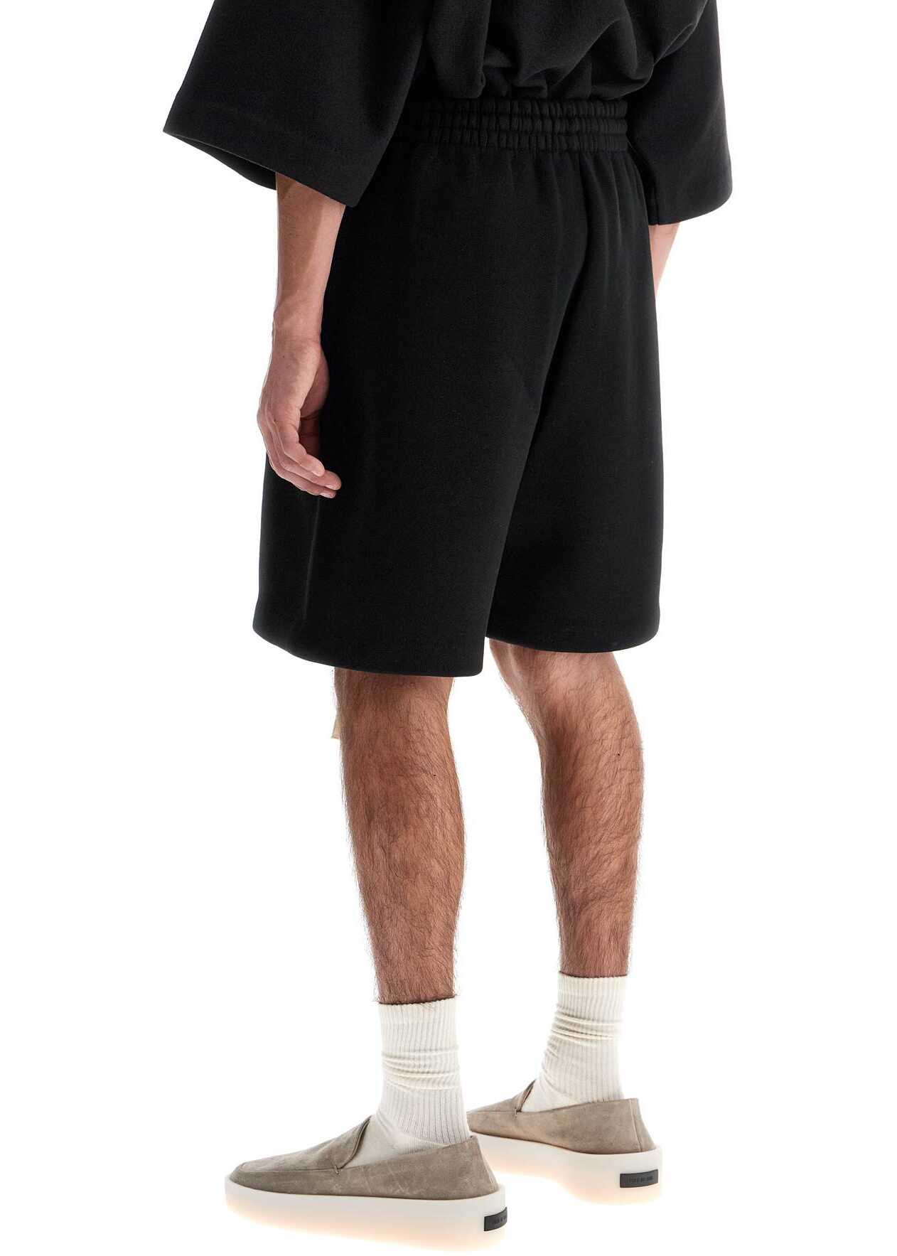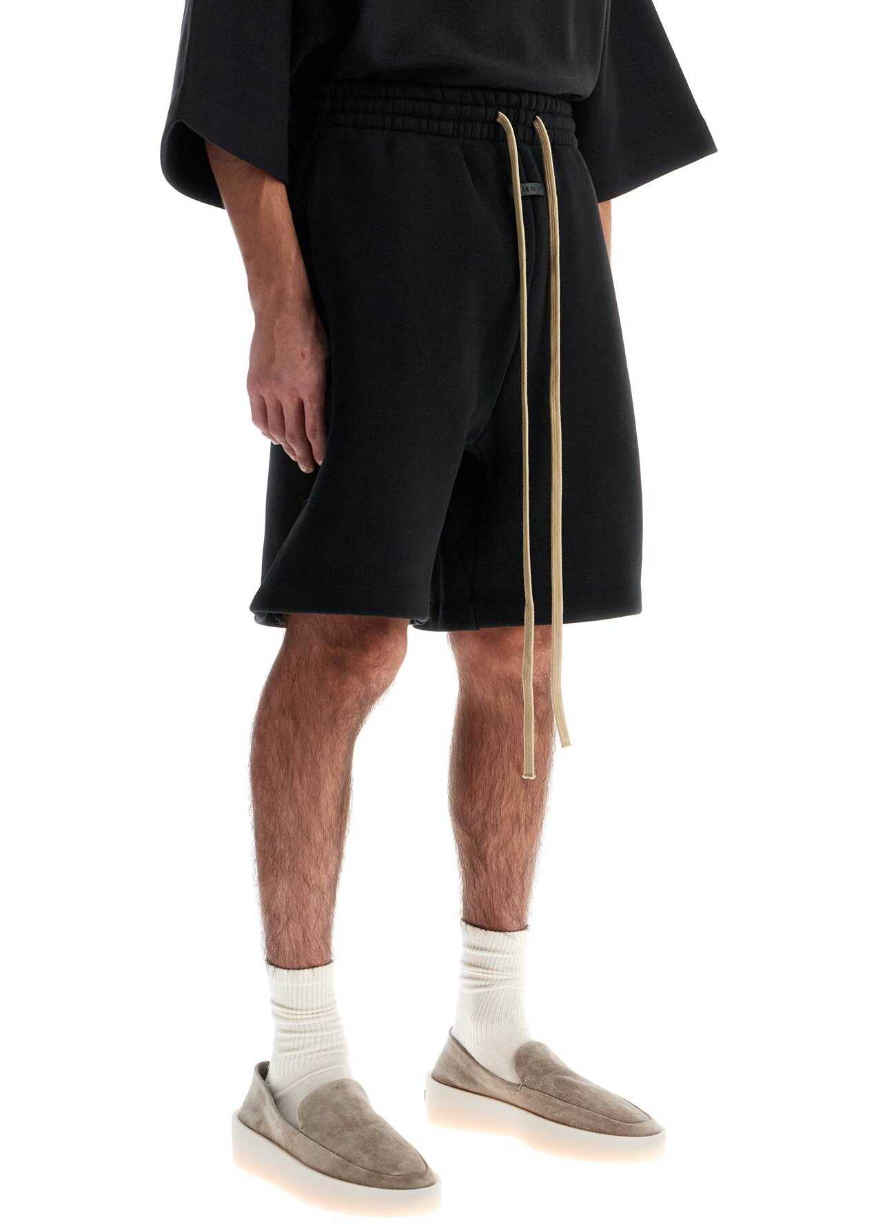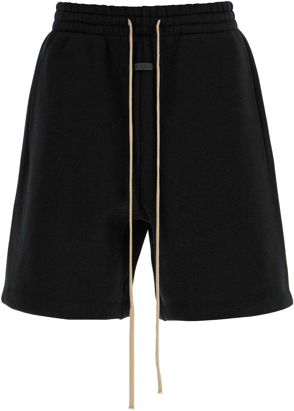 Fear of God's sporty Bermuda shorts are made from compact, technical cotton jersey with a soft fleece lining. They feature an elasticated waistband with a large drawstring and side pockets. The front is adorned with a leather logo patch. These shorts have a relaxed fit and the model is 182 cm tall and wears a size M.