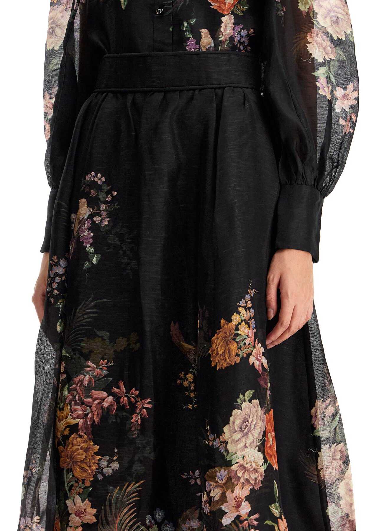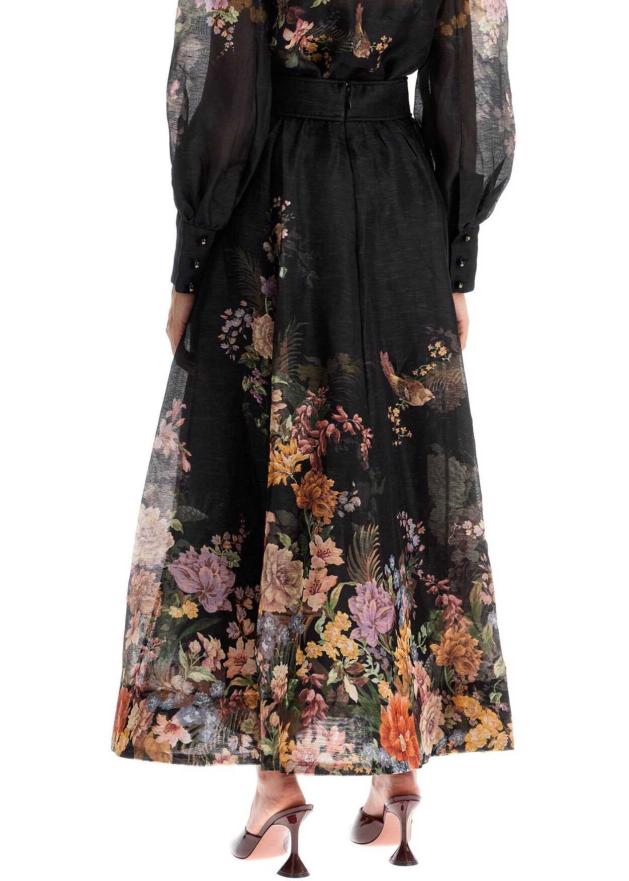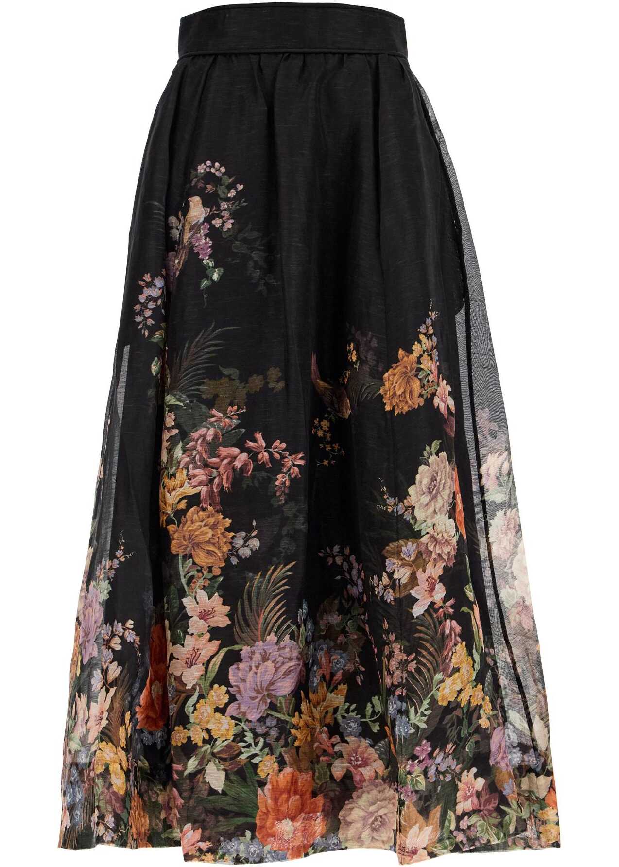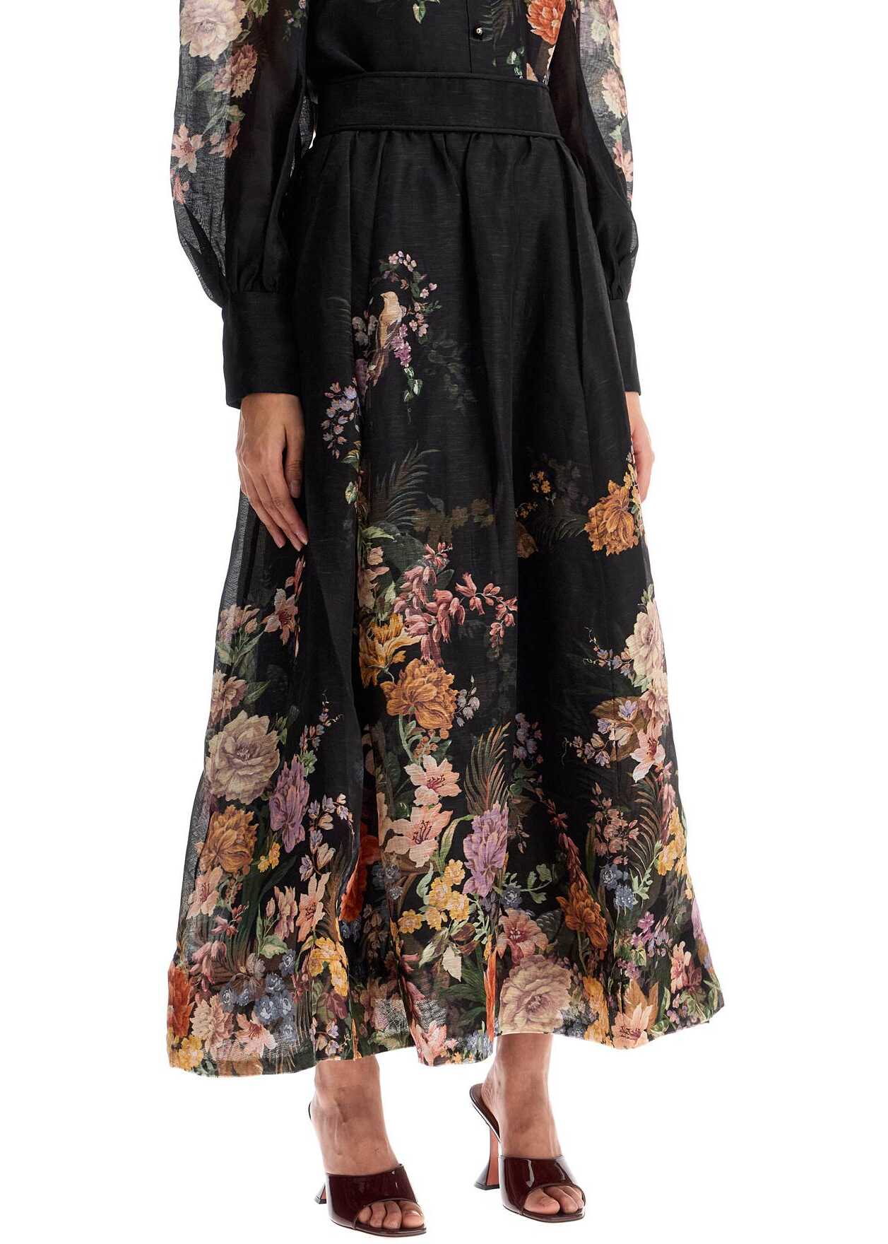 This Zimmermann maxi skirt is made of linen and silk organza with a placed floral pattern. It features a flared silhouette enhanced by a high waist with ruching details. The skirt also has side pockets inserted in the hips and an invisible zip closure at the back. It is fully lined on the inside. The model is 177 cm tall and wears a size 1.