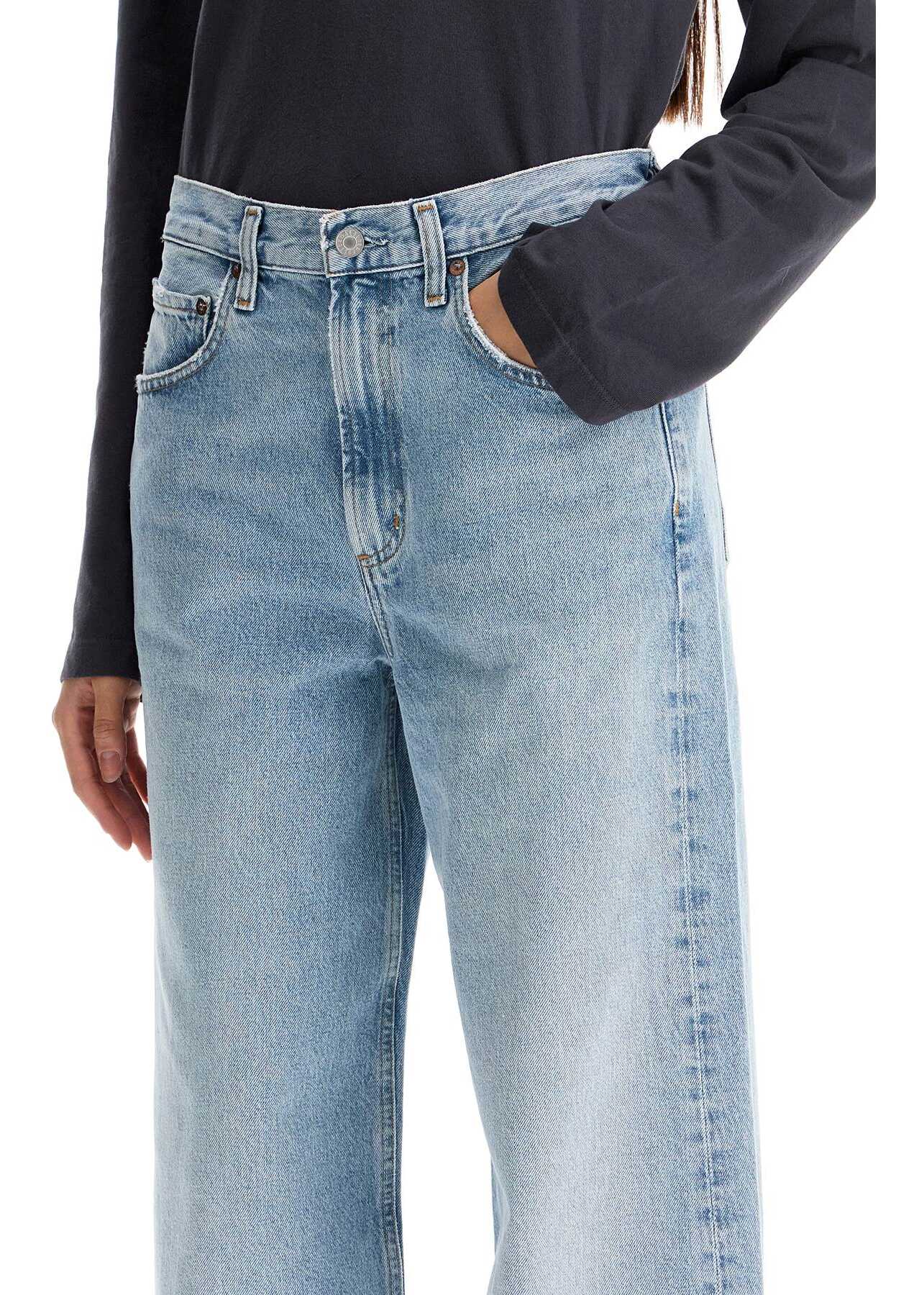 Agolde jeans made from soft cotton sourced from regenerative agriculture, featuring a dark vintage wash and a relaxed fit with a curved leg and low rise. They have a hidden zip closure with a branded button and belt loops at the waist. The model is 177 cm tall and wears a size 26.