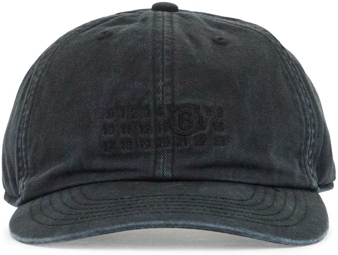 The MM6 Maison Margiela baseball cap is made of washed cotton gabardine and features the iconic Numeric Signature tone-on-tone decoration on the front. It has a classic six-panel construction, slightly curved brim, embroidered eyelets, and an adjustable strap at the back. The cap is lined and the one in the photo corresponds to size M.