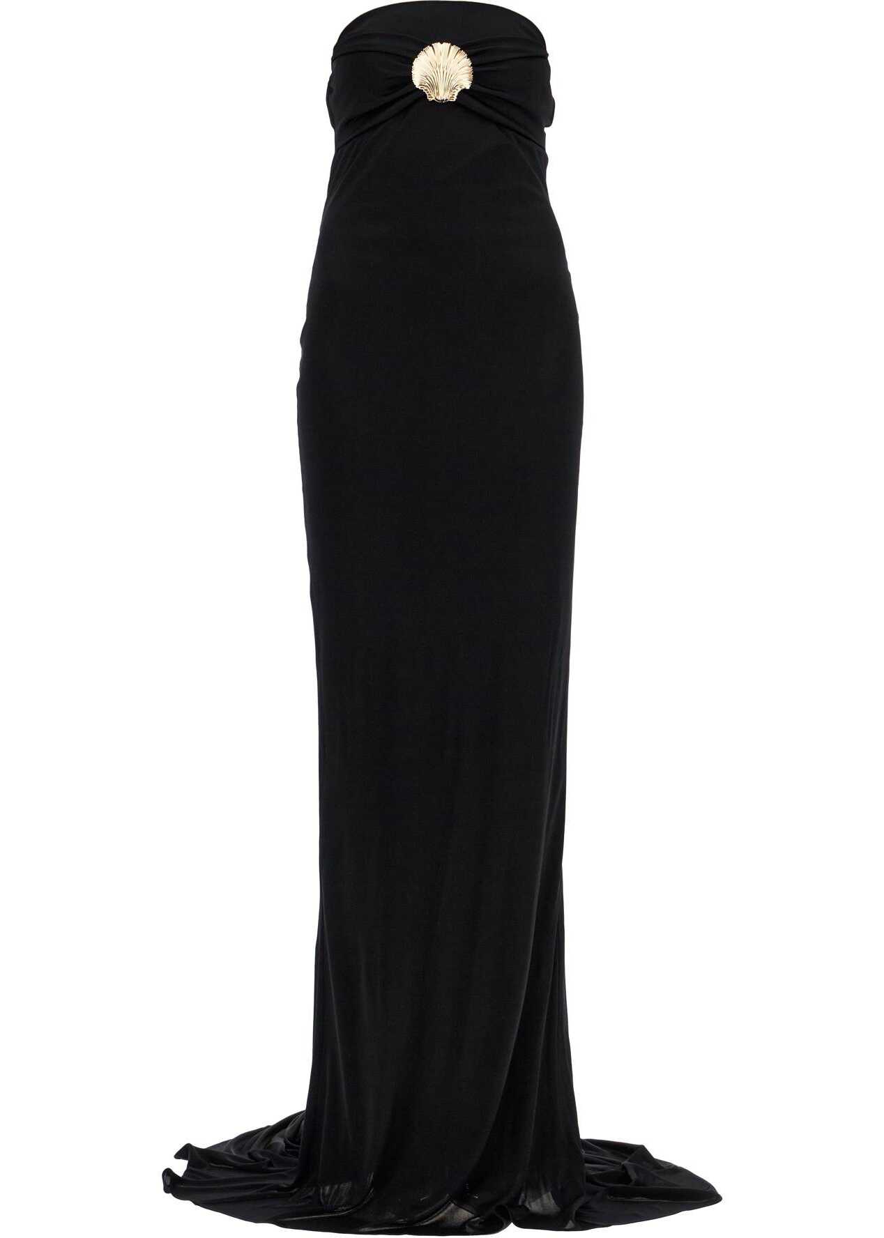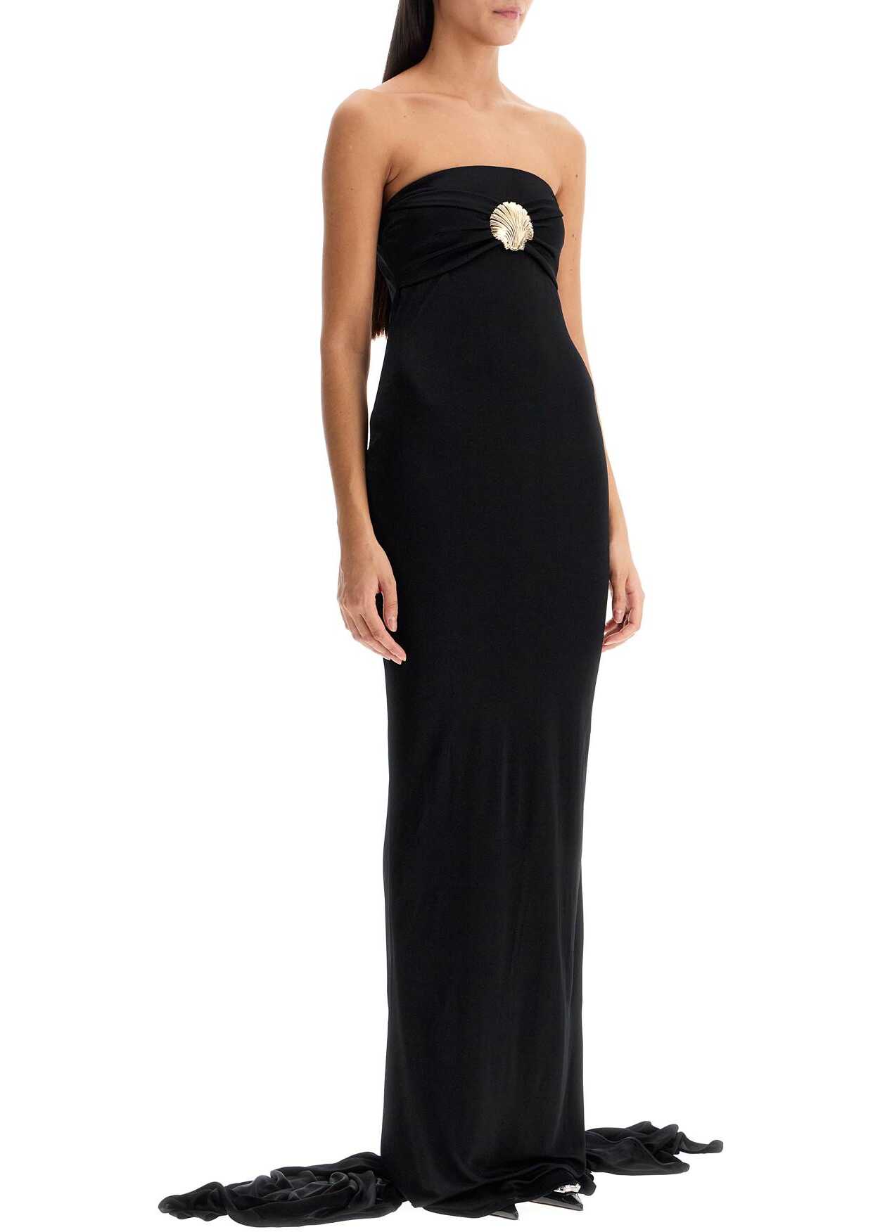 Crafted from soft, shiny viscose jersey, this maxi dress by Giuseppe di Morabito features a bandeau design adorned with draping and a removable gold metal shell brooch. The form-fitting silhouette is enhanced by a floor-length hemline with a godet motif on the back. It has an invisible zip closure and hook at the back. The model is 177 cm tall and wears an IT size 40.