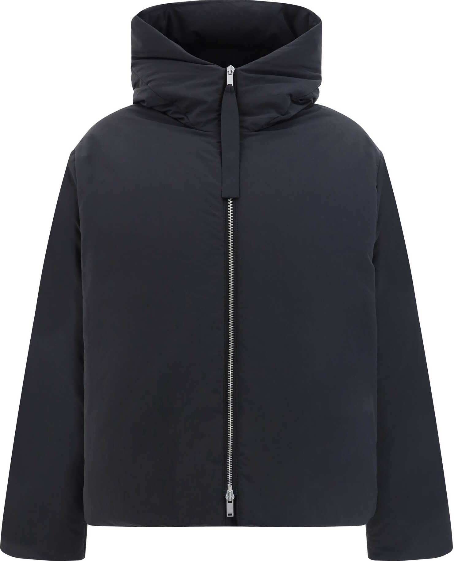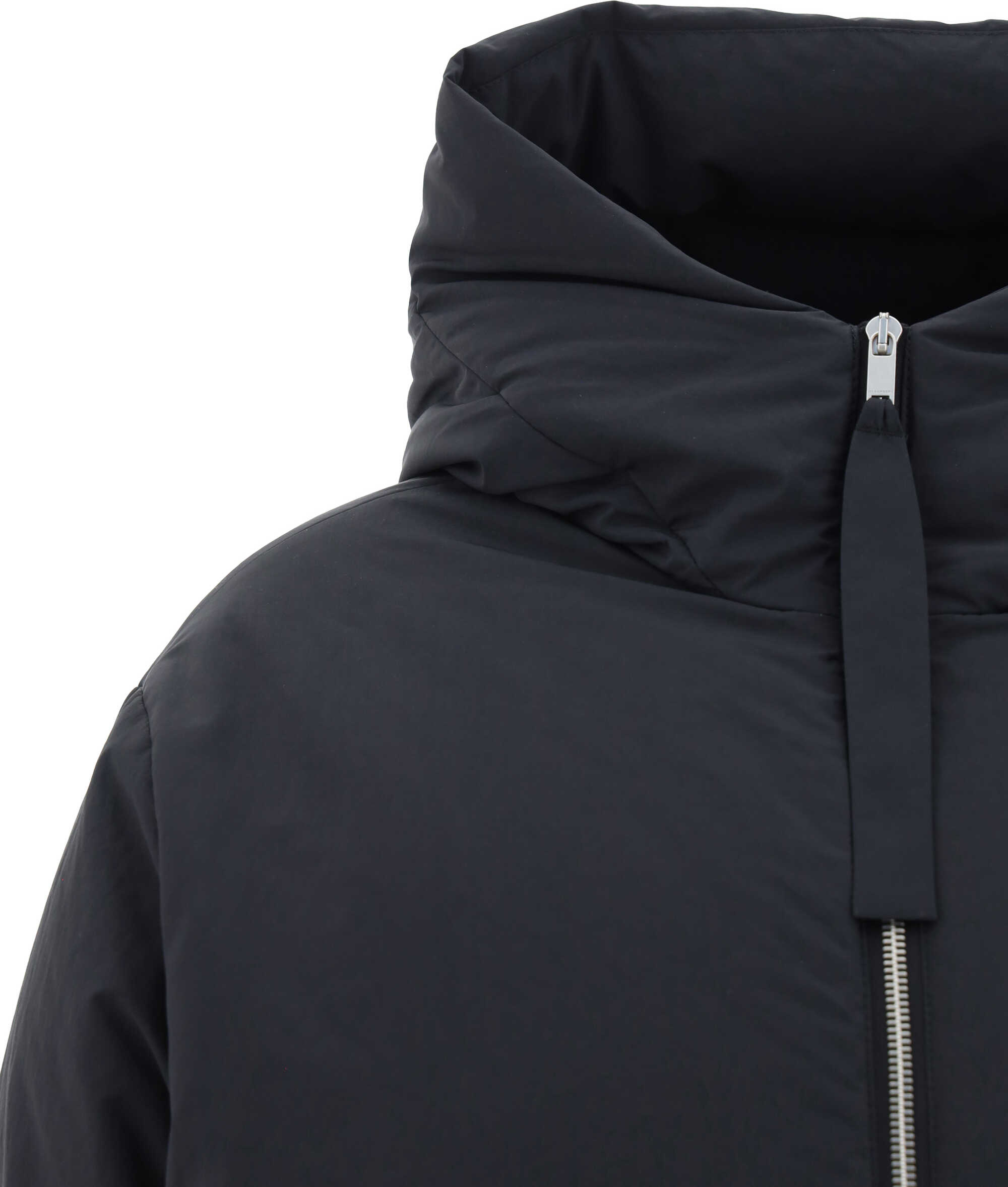Down Jacket by Jil Sander, high neck hooded design, double-slider front zipper closure, two side welt pockets, all-over padded and quilted design, adjustable drawstring hem, monochrome pattern, oversize fit.