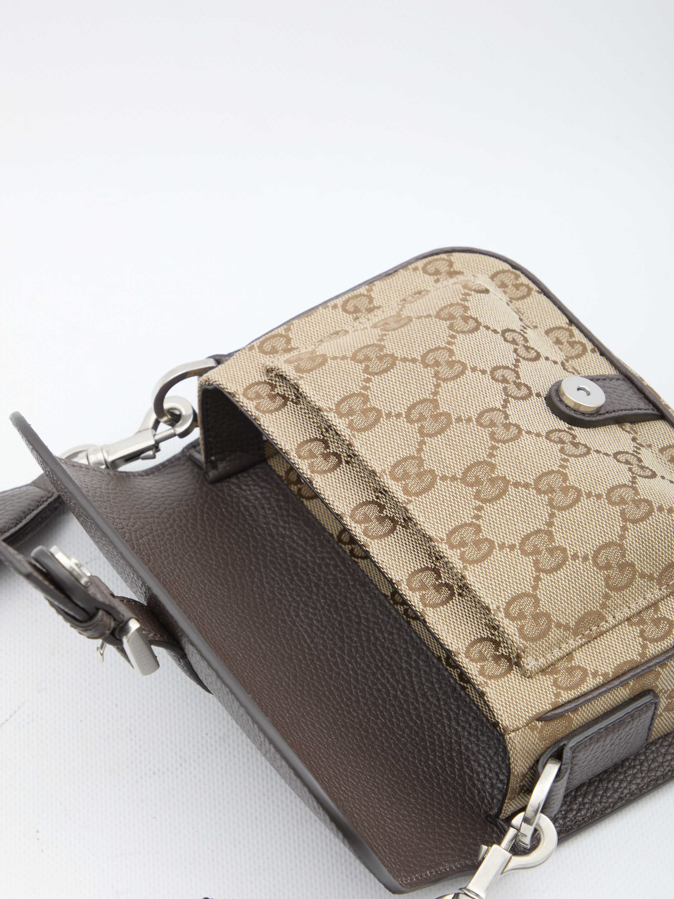 GG mini bag in beige and ebony Original GG fabric and leather with silver-tone hardware. It features adjustable and detachable shoulder strap, magnetic closure with buckle detail, one main interior compartment and one open pocket under the flap. Original GG fabric lining. Dust bag included. Any leather imperfections are not to be considered manufacturing defects, but a peculiarity of the material.