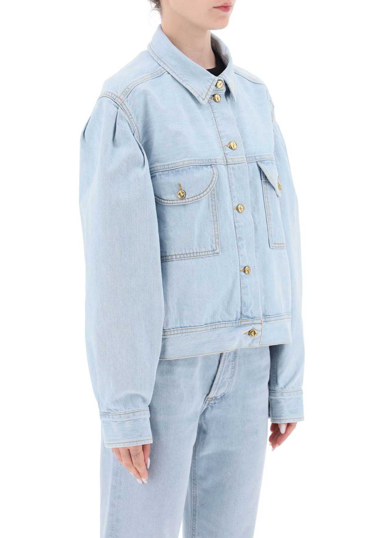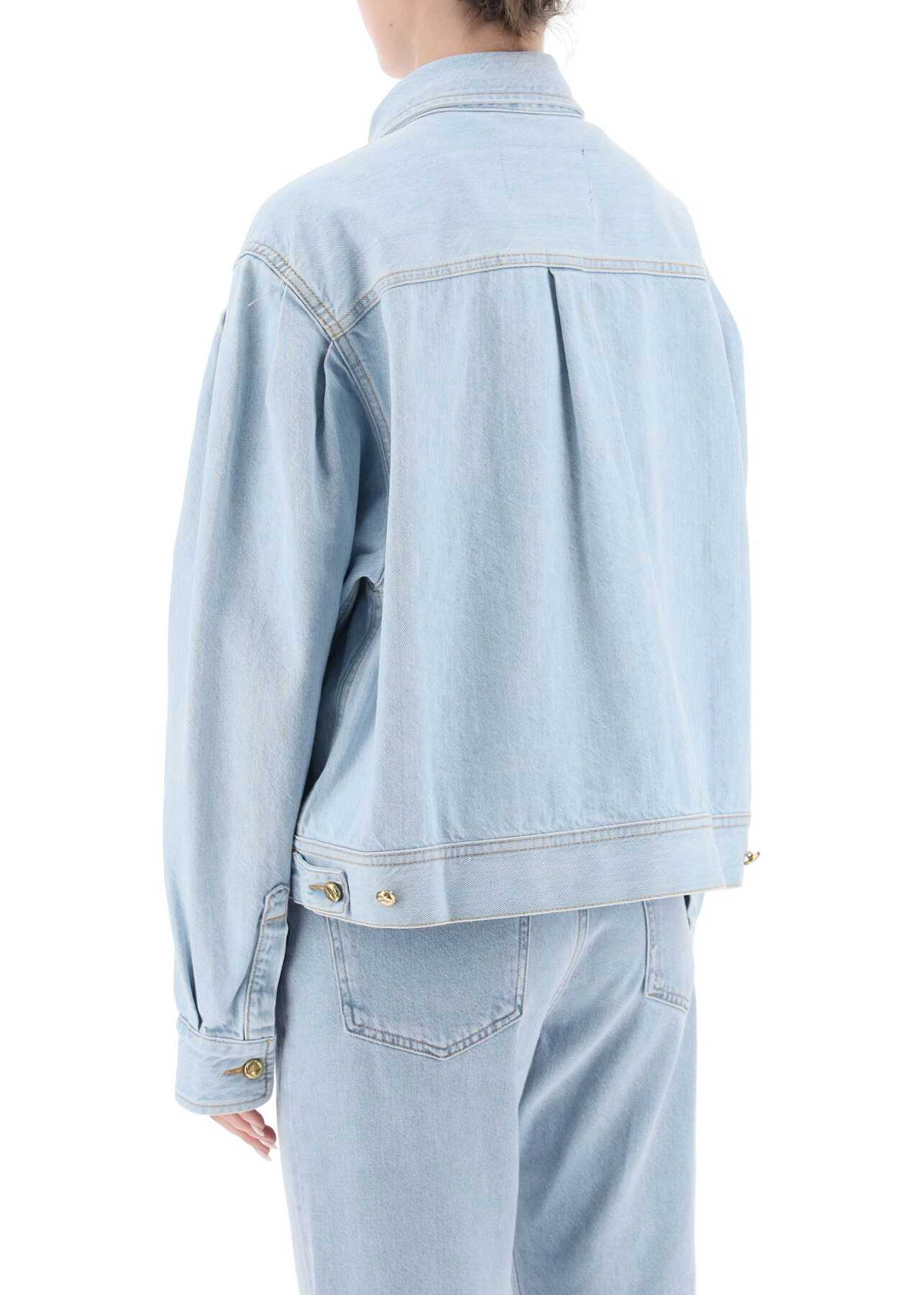 Blazé Milano denim jacket crafted in light sun-washed pure cotton. Characterized by a boxy cut with wide gathered sleeves and single-button cuffs, this garment features pointed collar, front gold-tone metal loden button closure, chest pockets with flap and side welt pockets. Oversized fit. The model is 177 cm tall and wears size 1.