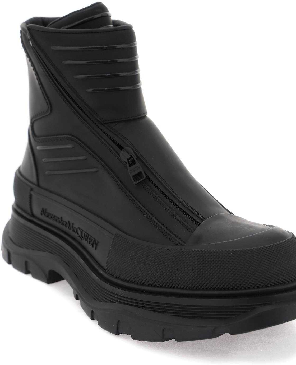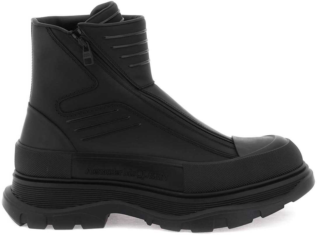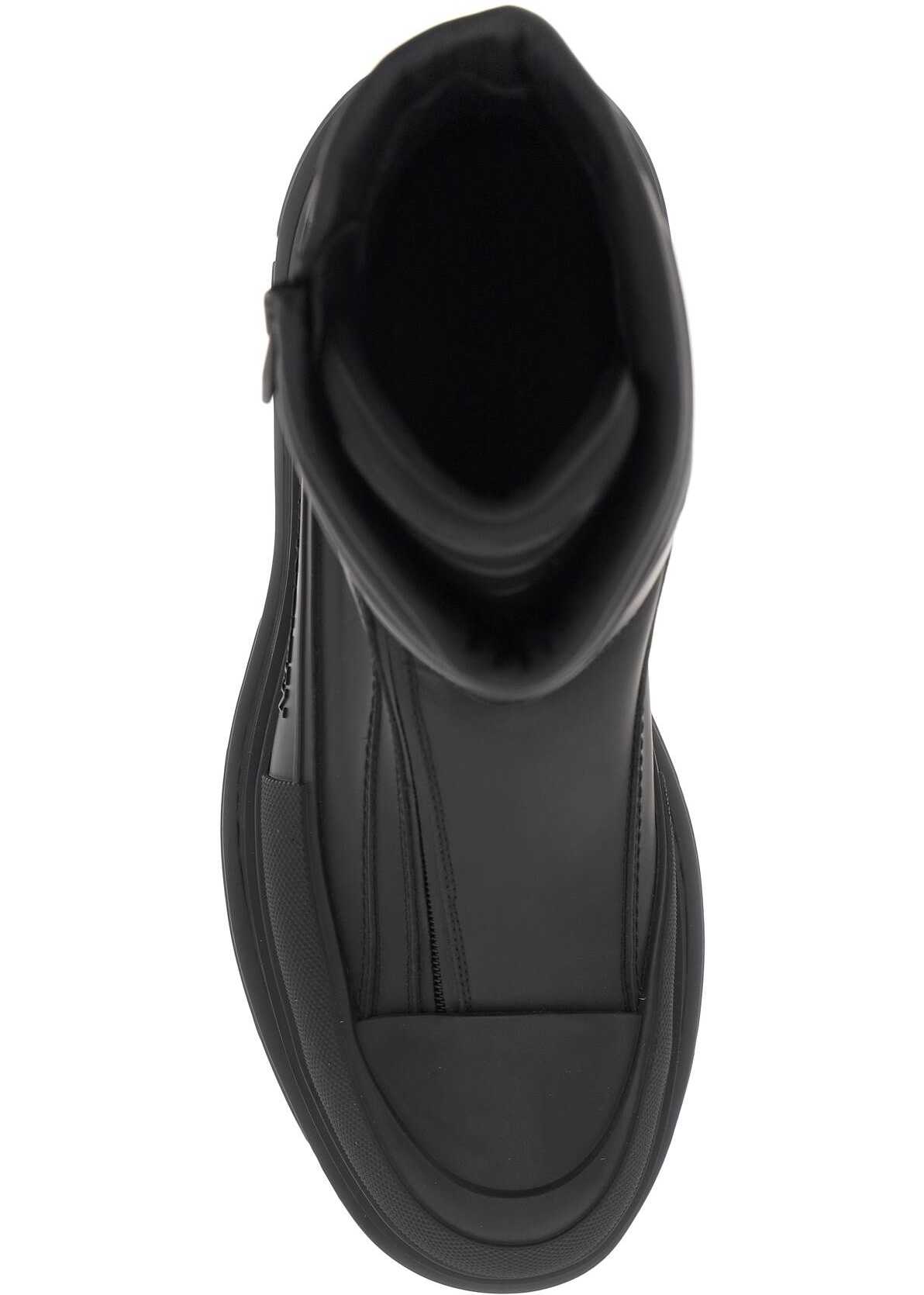 Alexander McQueen ankle boots made of rubberized fabric with shiny embossed details and side zipper closure. They feature an oversized rubber lug sole with embossed lettering logo on the outer side. Technical fabric lining, leather insole.