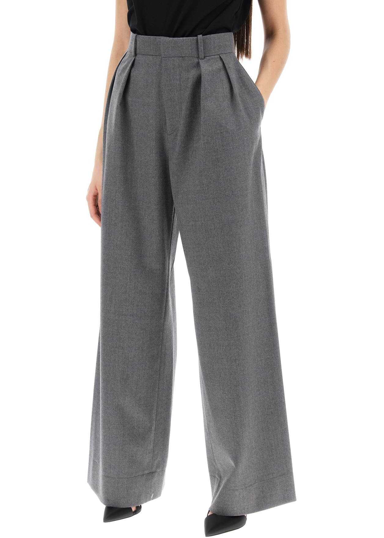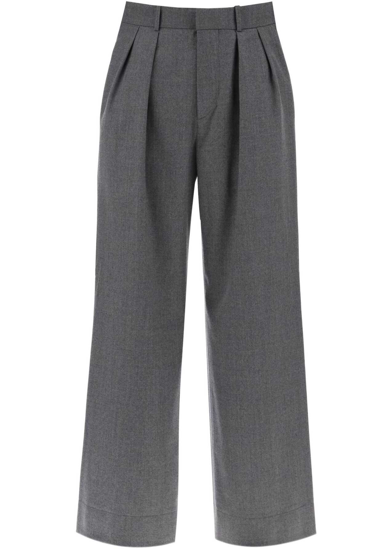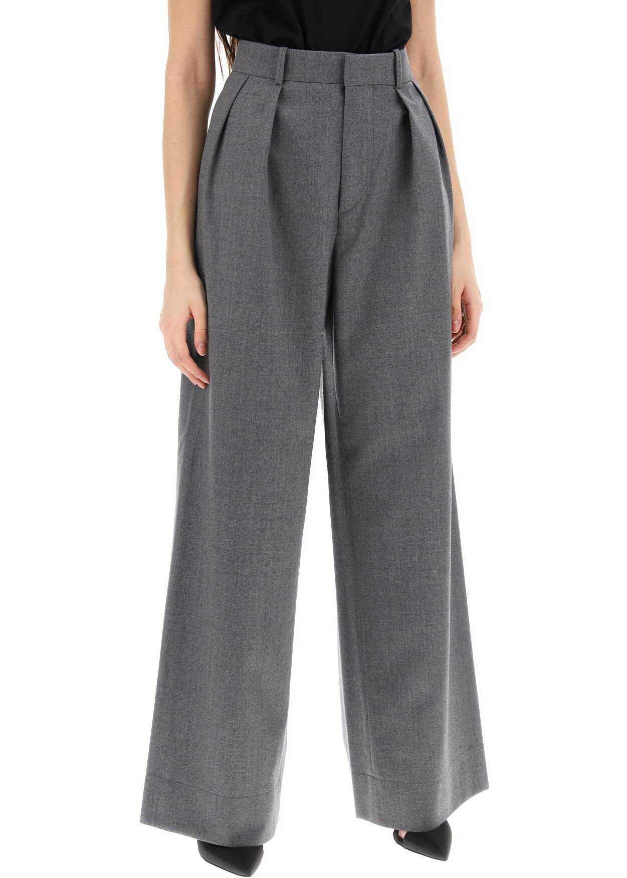Wardrobe.NYC pants made of pure virgin wool flannel, with a wide high-waisted cut enhanced by front pleats. They feature a front zip and hook closure, side French pockets, and back welt pockets. The model is 177 cm tall and wears size XS.
