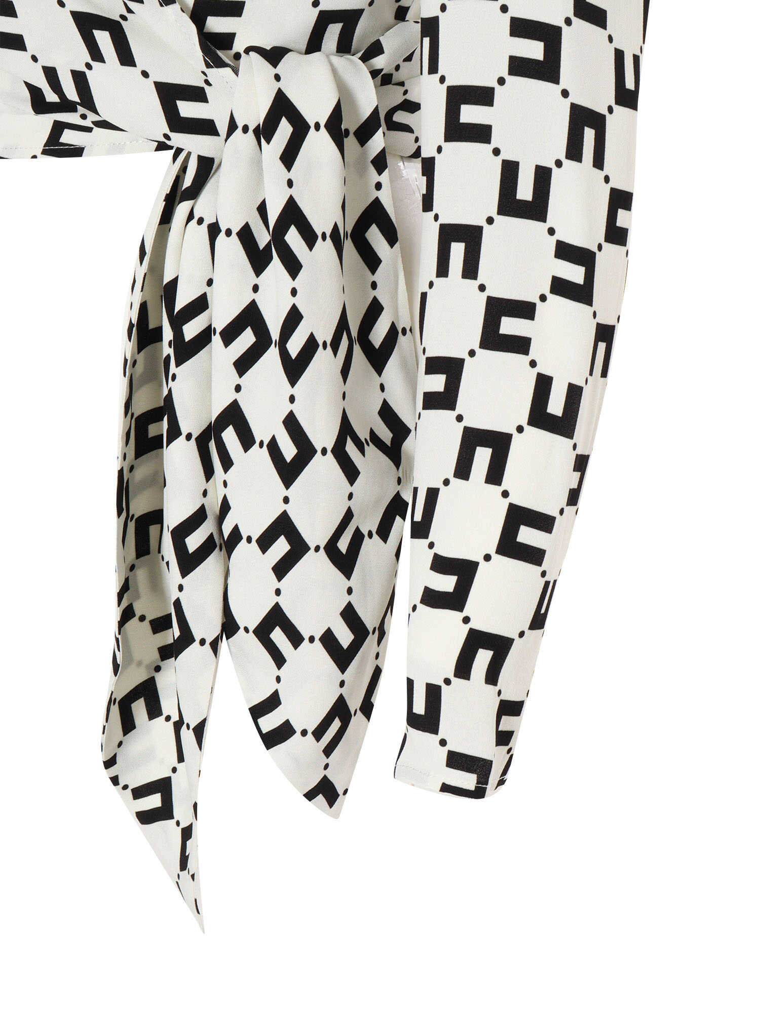 White cropped shirt with long sleeves and all-over black lettering logo.