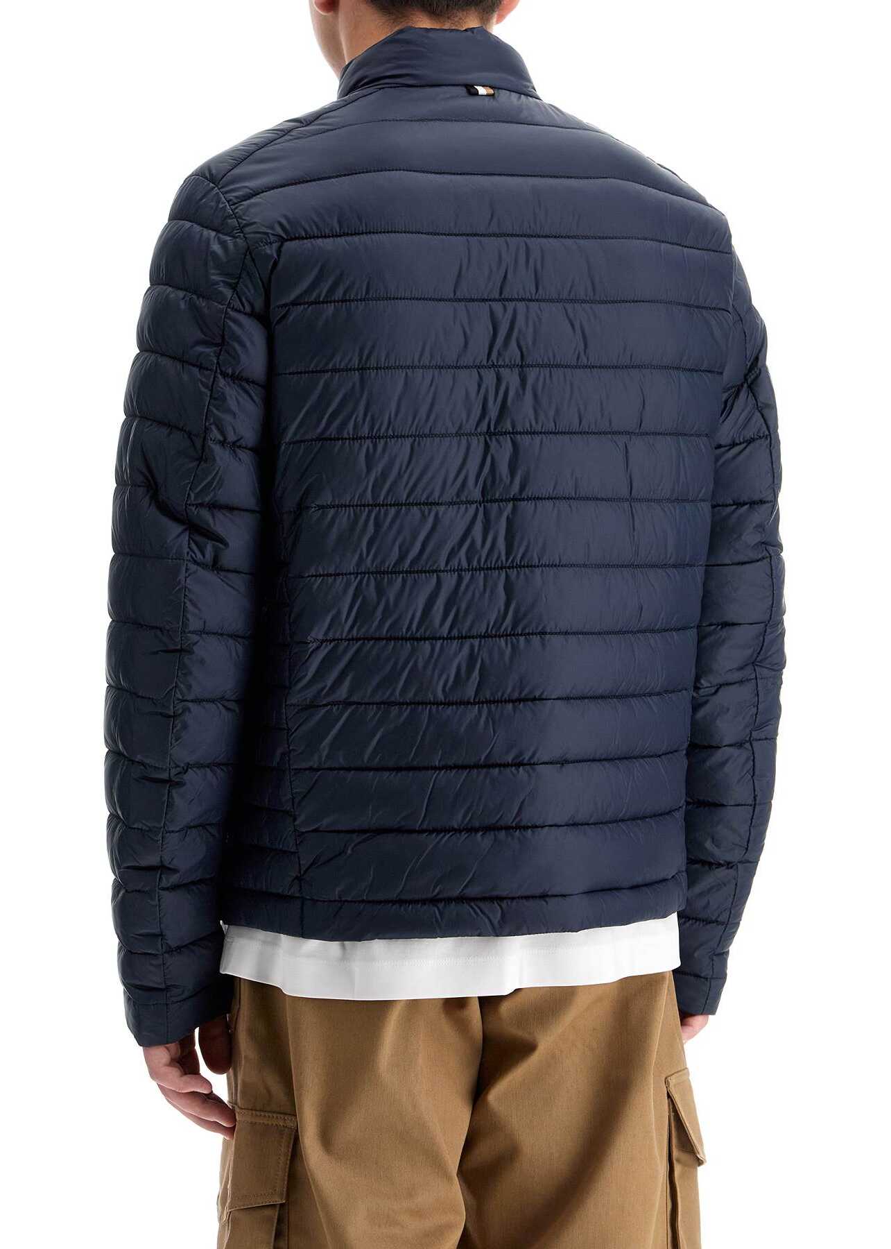 The BOSS down jacket is made of quilted nylon with a light padding of recycled polyester and treated with a water-repellent coating. It features a stand-up collar, zip closure, front pockets closed by snaps, and a tonal printed logo on the chest. Regular fit. The model is 182 cm tall and wears size IT 48.