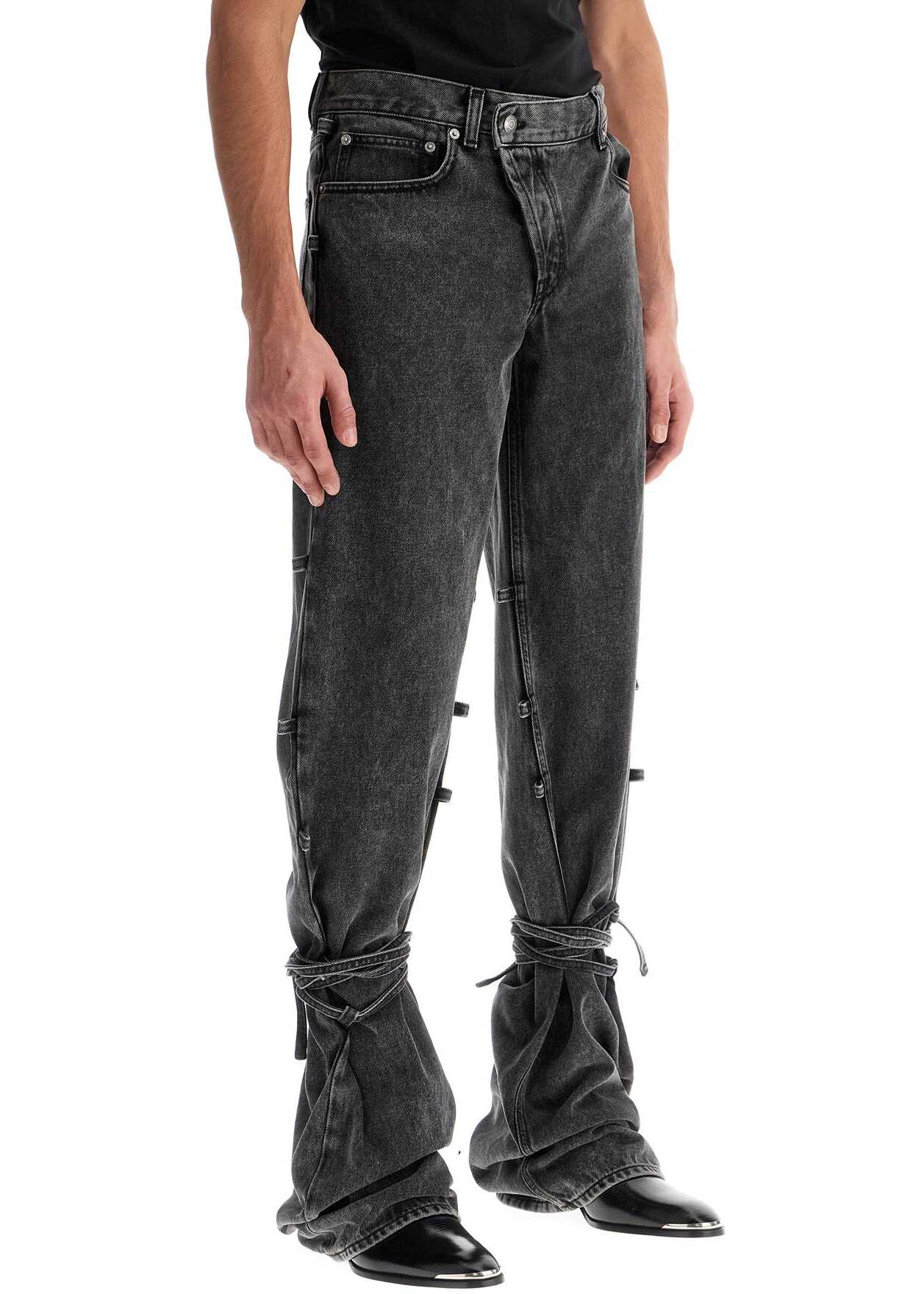 These Alexander McQueen baggy jeans are made of black denim with a distressed treatment and feature a knotted detail at the ankles, an asymmetric button closure, and multiple loops along the leg. The five-pocket style is finished with a hammered leather jacron on the back. The model is 182 cm tall and wears size IT 48.