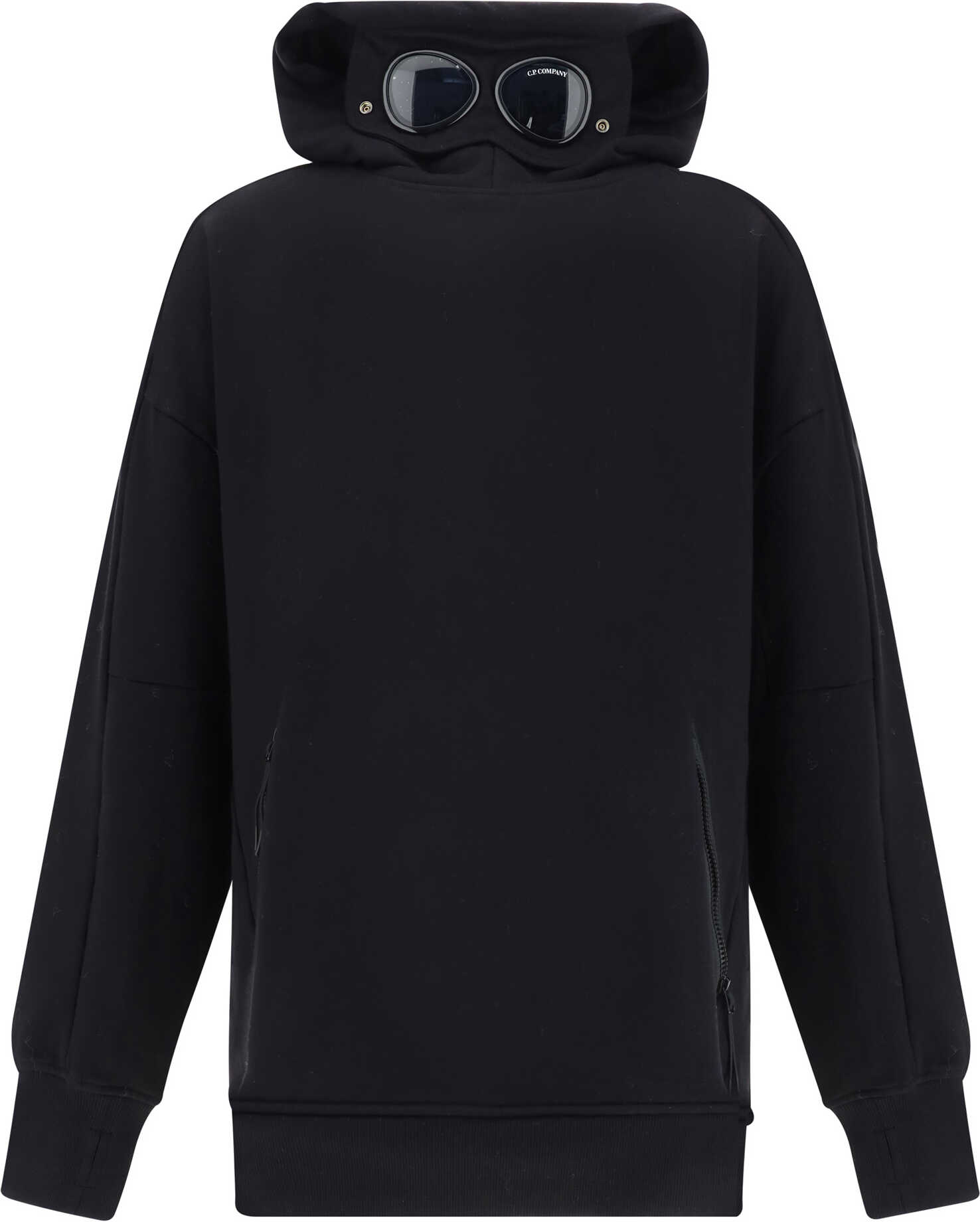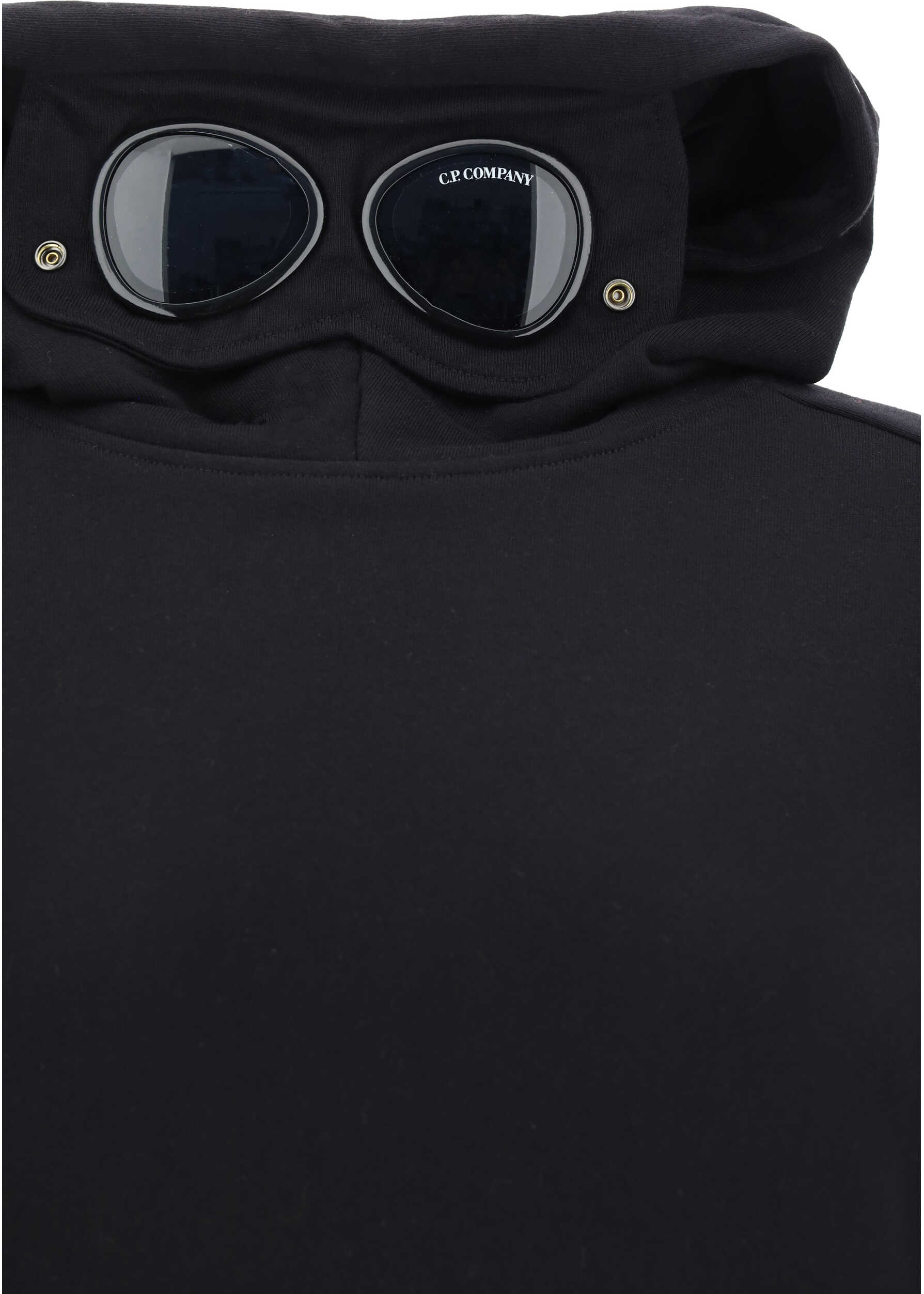 Cotton Hoodie by C.P. Company, hood with attached sunglasses detail, ribbed cuffs with thumb holes, ribbed hem, front kangaroo pocket with zippers, plush interior, monochrome pattern, regular fit.