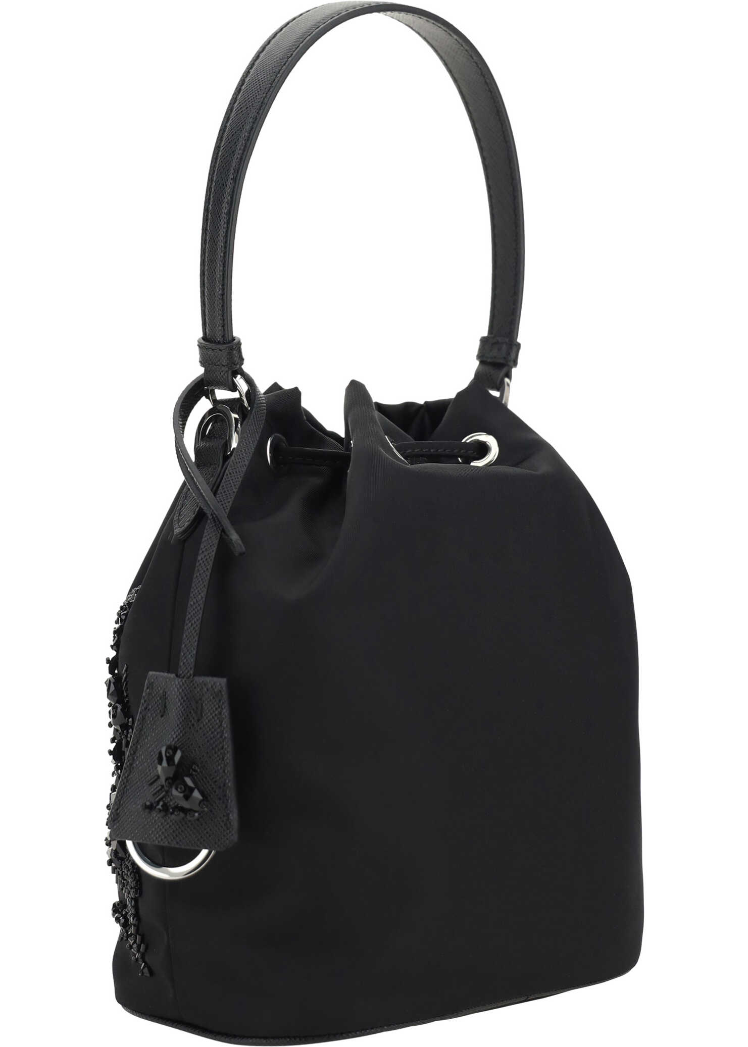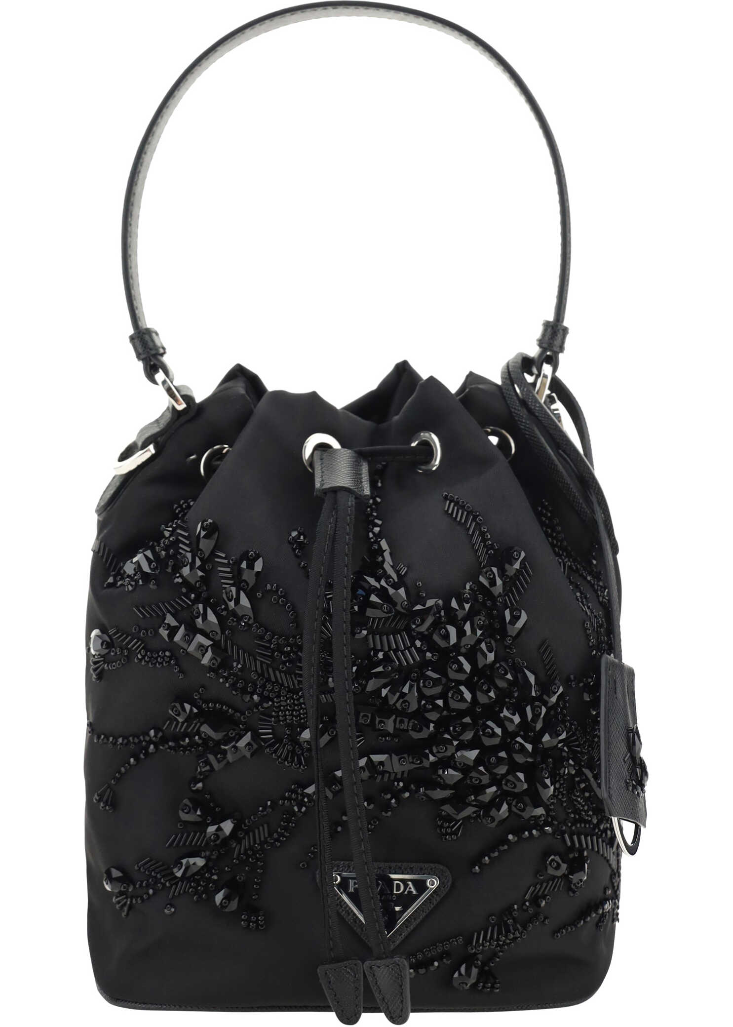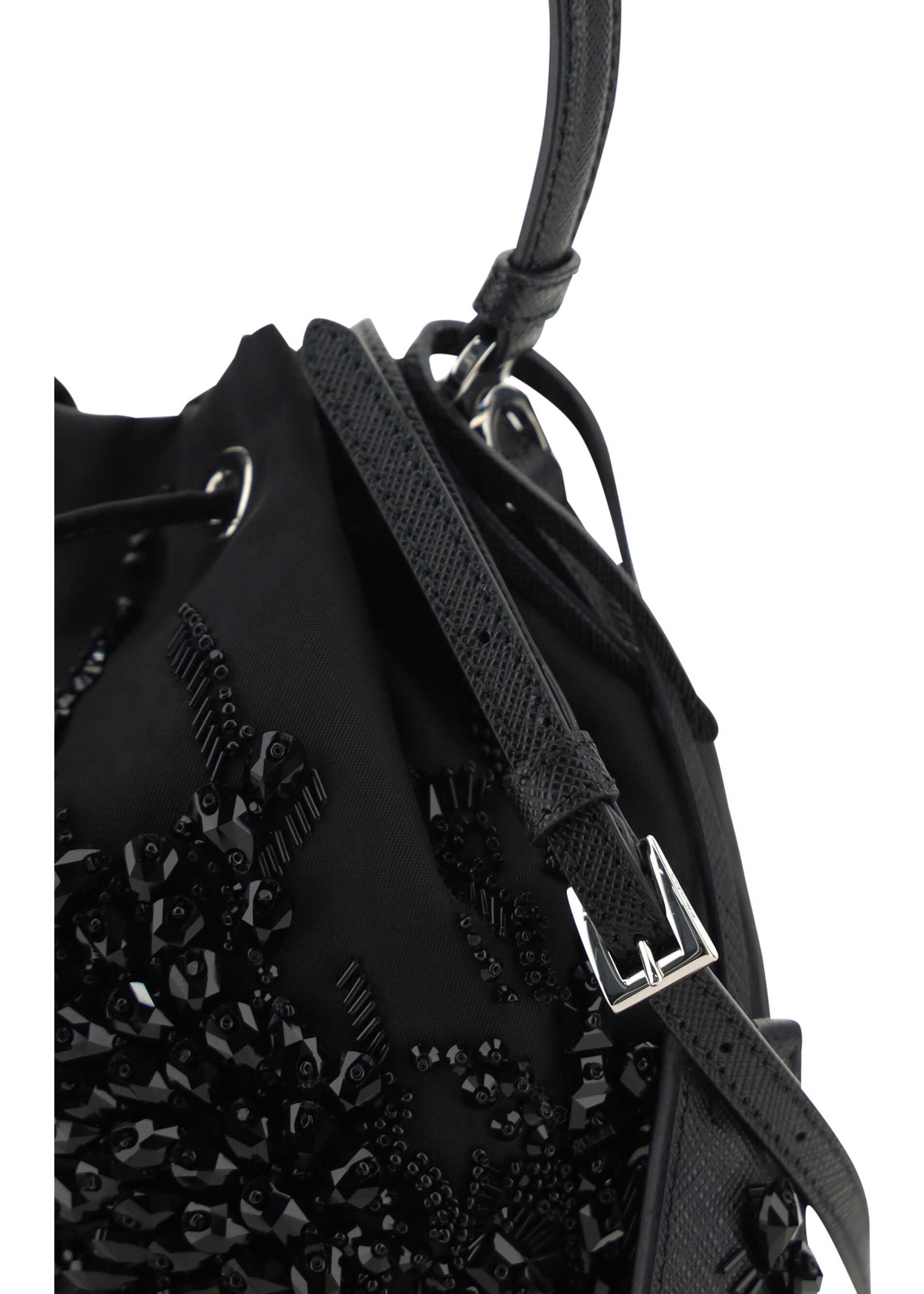 Bucket Bag by Prada, flat circular top handle, drawstring closure at top, sequin and jewel applique details on front, single interior compartment, adjustable and removable leather shoulder strap.