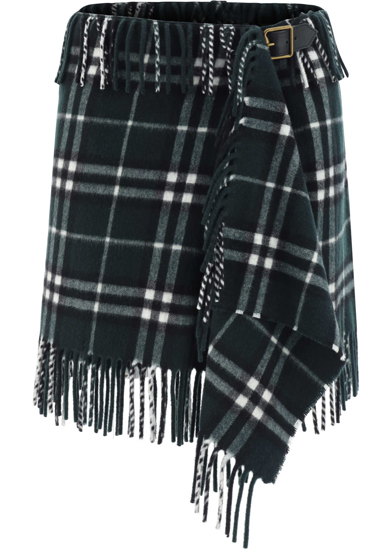 Wool Mini Skirt by Burberry, scarf-style design, deep side slit, closure by leather strap with adjustable buckle, frayed hems, iconic all-over printed Archivio Check pattern, regular fit.