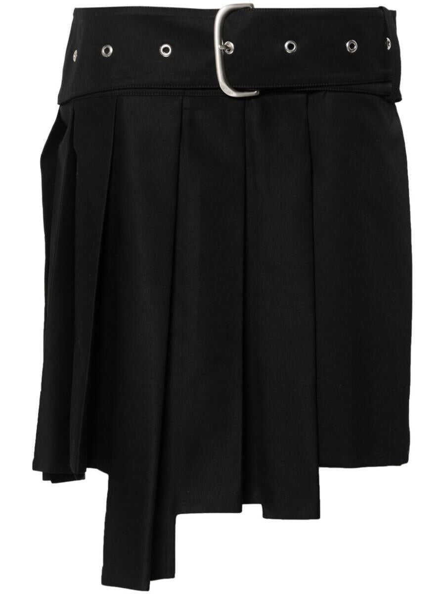 black cotton twill weave wraparound style fully pleated thigh-length asymmetric hem full logo-jacquard lining belted waist