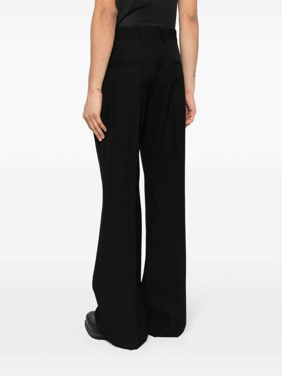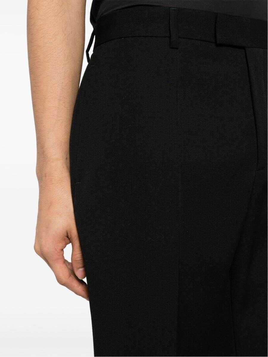 black wool flared cuffs belt loops pressed crease concealed front fastening two side inset pockets two rear welt pockets cotton lining