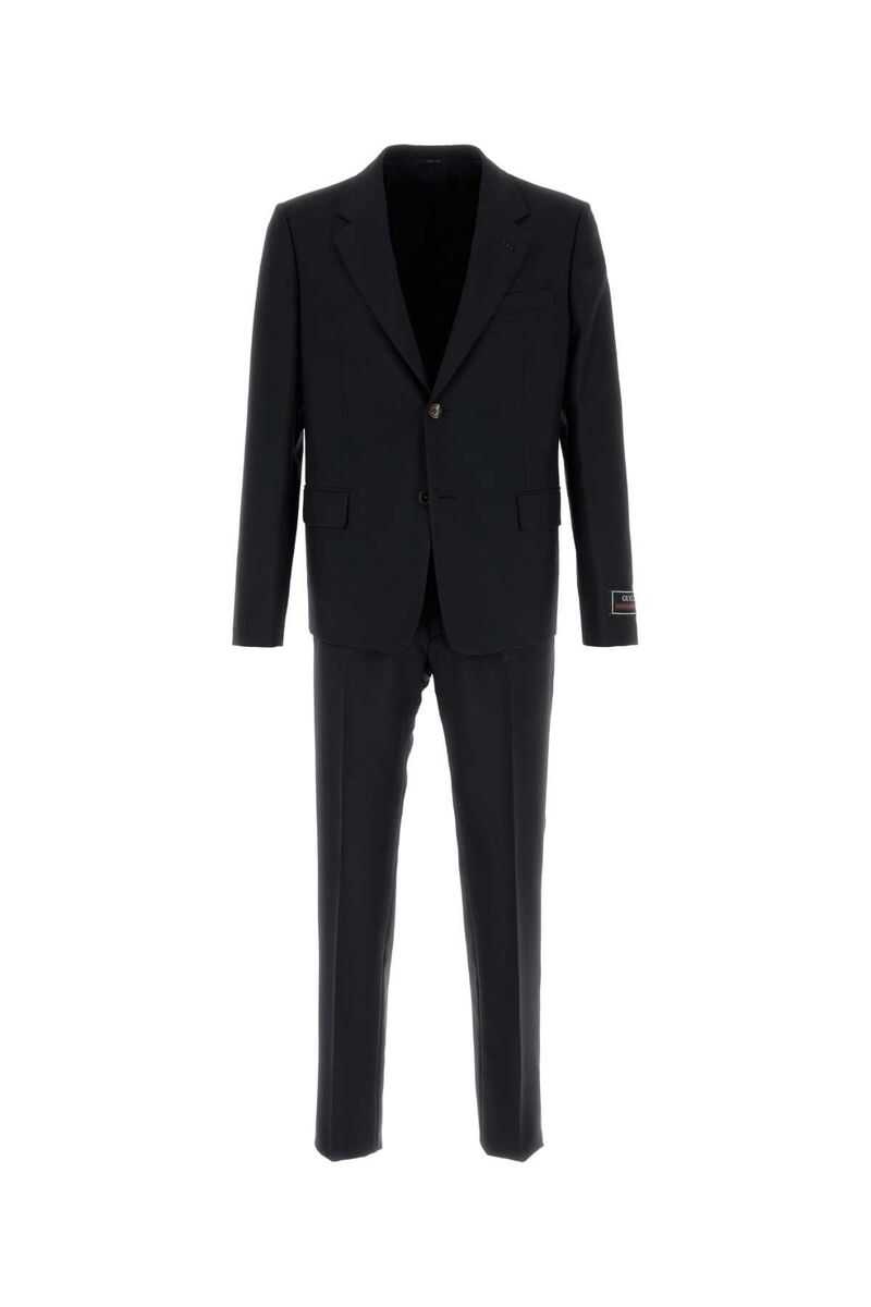 navy blue wool Jacket: notched lapels front button fastening long sleeves appliqué logo chest welt pocket two front flap pockets internal patch pockets American rear vent full lining Trousers: pressed crease belt loops concealed front fastening straight leg This piece fits true to size. We recommend you get your regular size