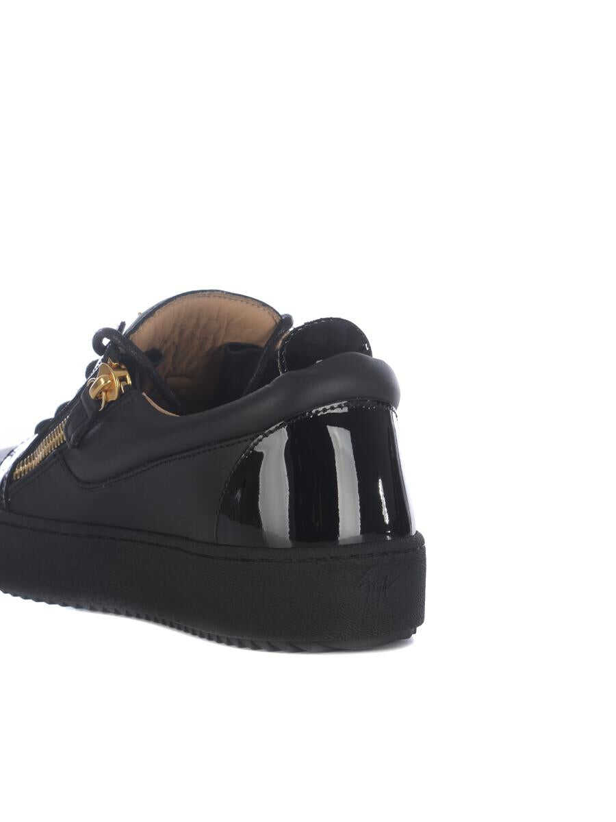 Sneakers Giuseppe Zanotti "Frenkie" made of Black leather. Patent inserts. Round tip. Golden metal "Signature" on the tongue. Laced. Tone-on-tone lace. Side Golden metal waxed zip closure. Black rubber sole. Logo embossed on the back.