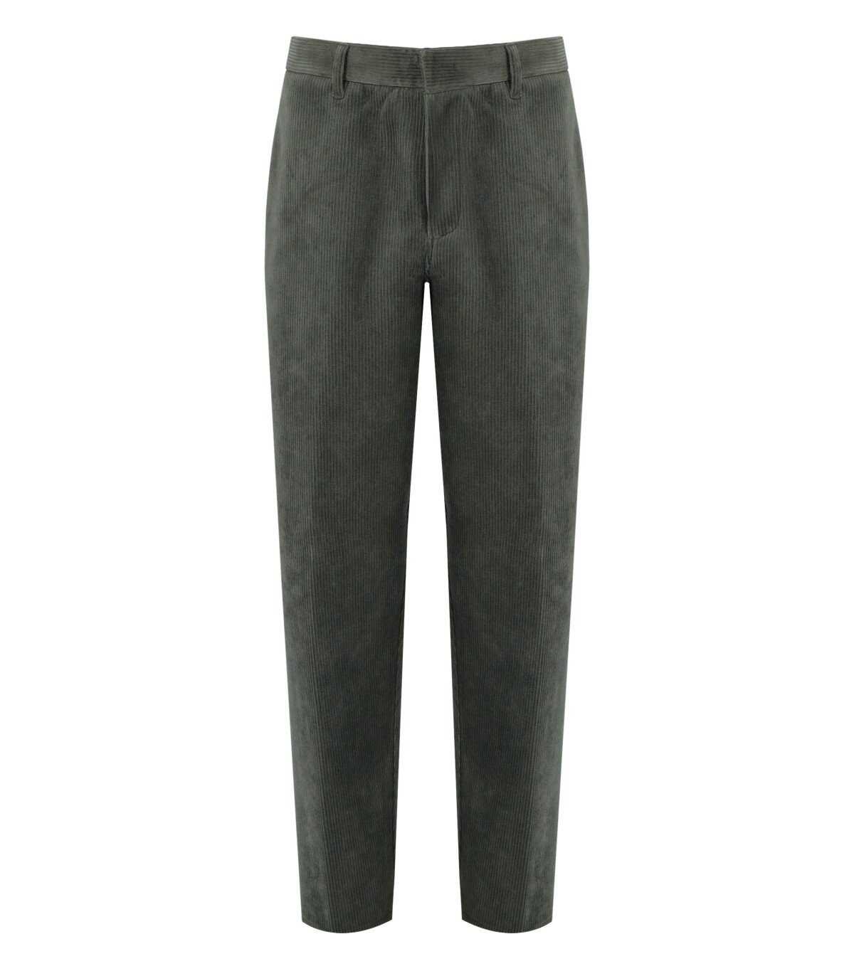 Emporio Armani trousers made of vertical ribbed green velour fabric. Characterized by a zip closure, hook, and button, it features a waistband with belt loops. Front side pockets. Back double welt pockets with button. Soft fit. The model is 188 cm tall and wears size 48/M. Composition: 60% Cotton 40% Polyester.