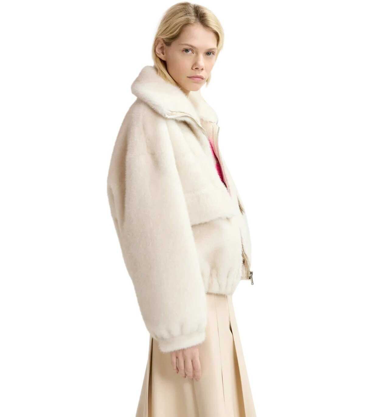 Genz bomber jacket by Essentiel Antwerp made of ecru synthetic faux fur fabric. Characterized by a soft silhouette accentuated by the hem and cuffs, it features an elegant collar. Zip closure. Front slit pockets and dropped shoulders. Elastic hem. Oversized fit.