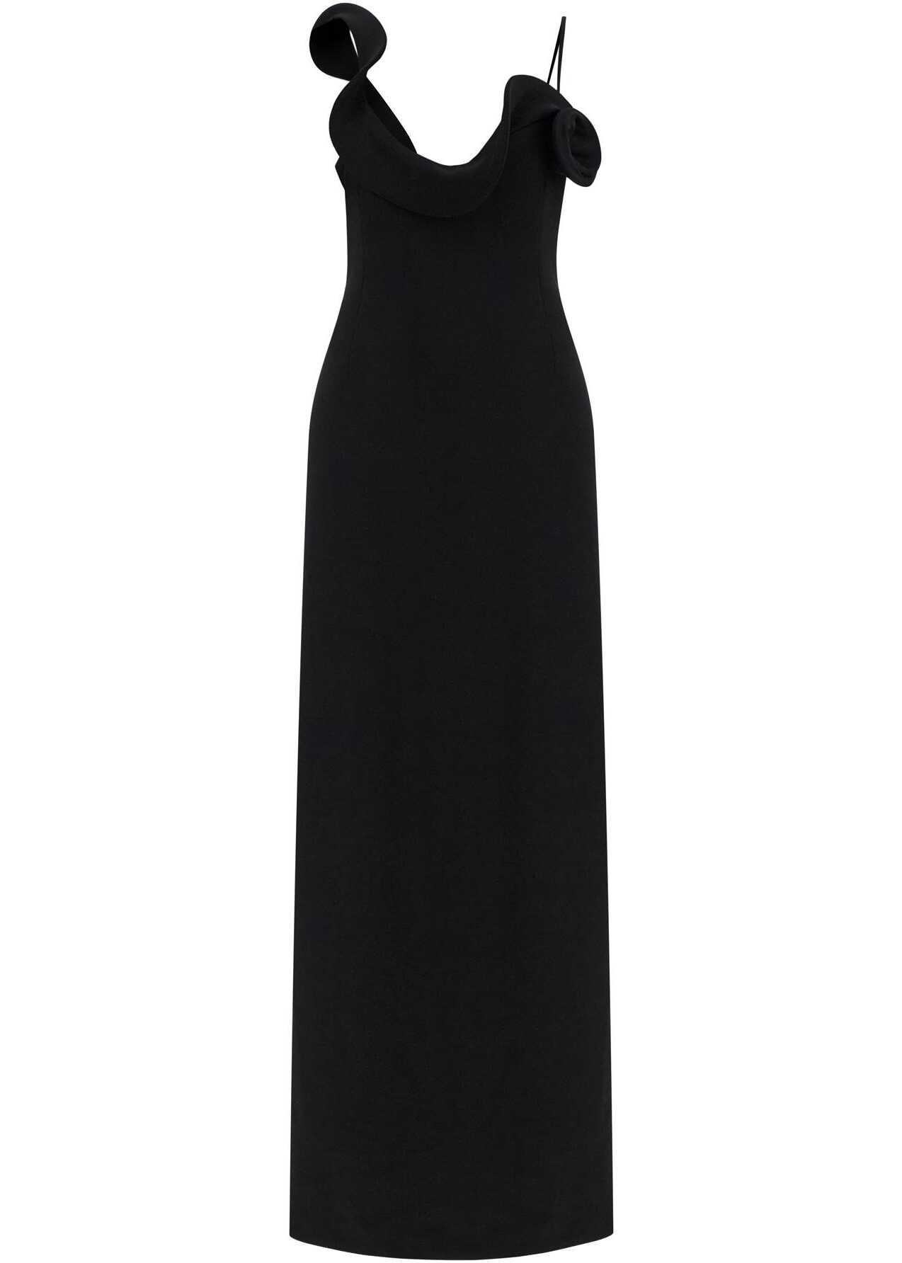 Crafted in stretch wool, this long dress by Magda Butrym features a sculptural ruffle with floral detail on the wide neckline. The column silhouette is fitted on the bodice and completed by a deep back slit. Invisible zip closure at the back. The model is 177 cm tall and wears size FR 36.