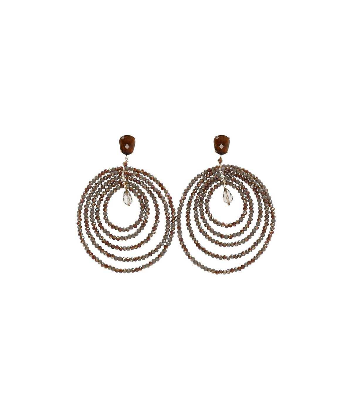 Glass earrings by Àlmala made of golden brass and crystals in shades of brown. Details in quartz, closure with needle and butterfly.
