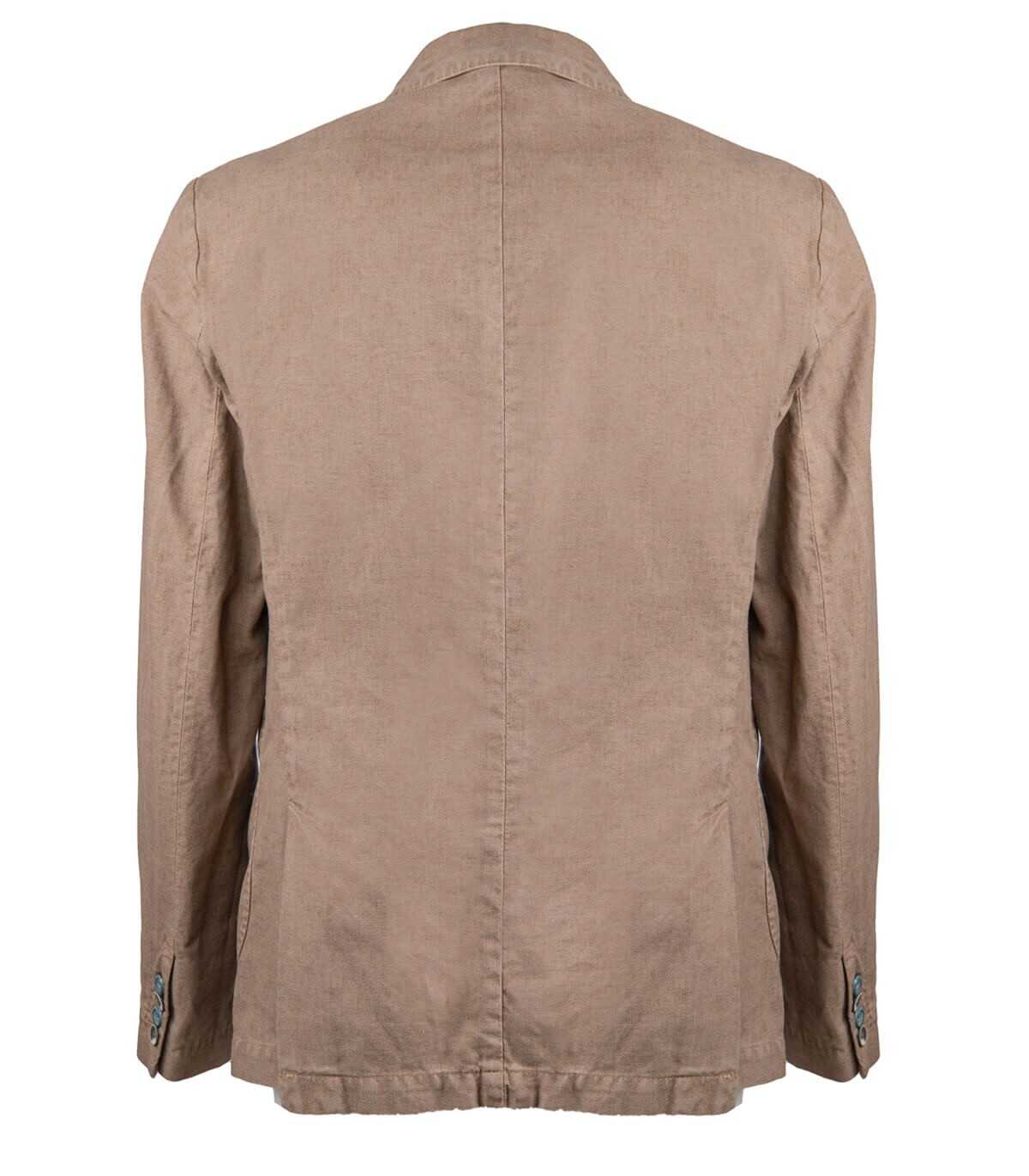 Domi Bob jacket made of beige cotton and linen. Front pocket with contrasting decorative handkerchief, single-breasted button closure and lined sleeves. Slits on the back.