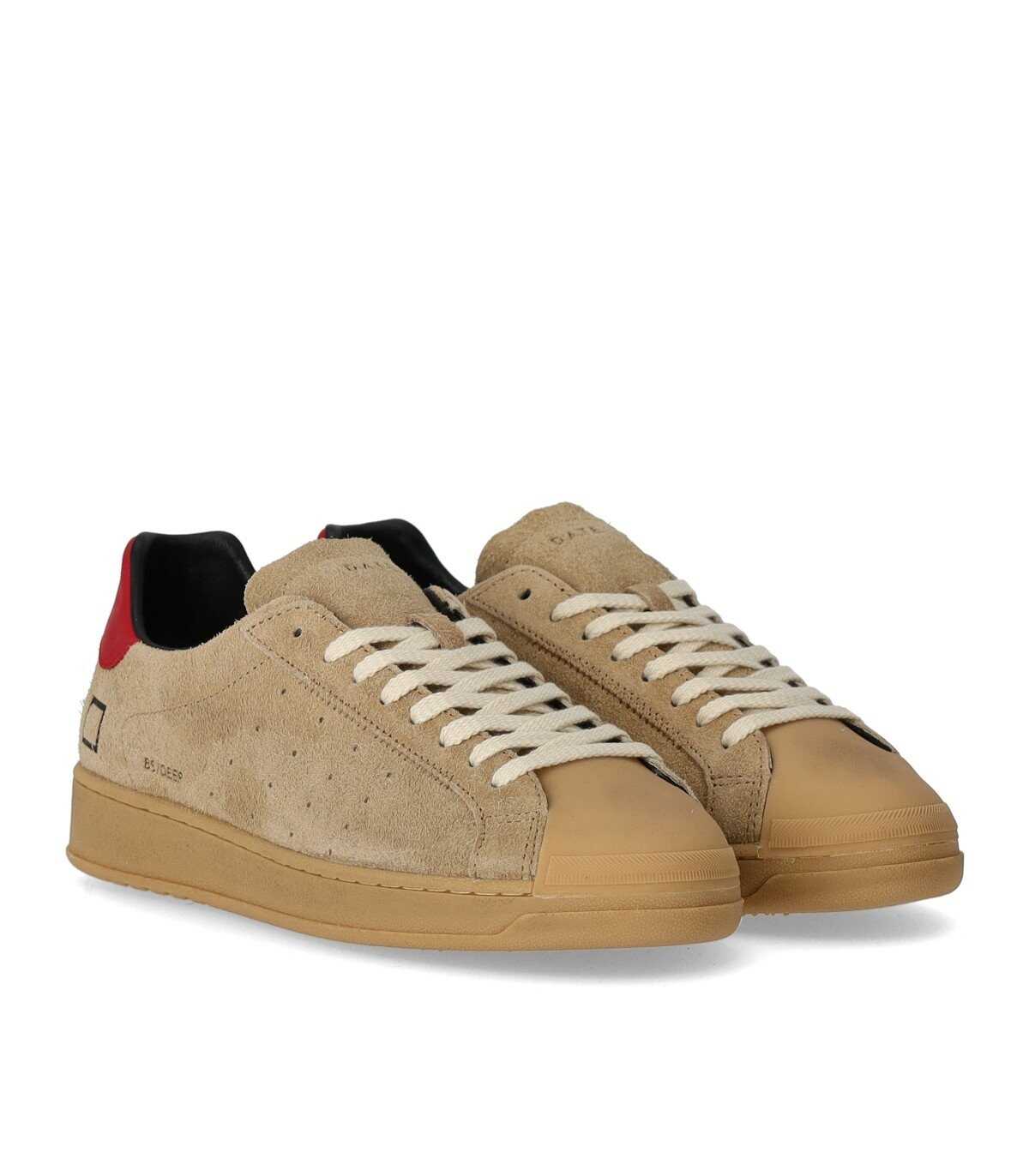 D.A.T.E. Base Deep sneaker is made in beige suede with a red leather insert on the heel. It has a leather and cotton sponge lining, with a removable leather insole. Cotton laces, logo embossed on the side and tongue. Rubber toe and sole, height 3 cm.