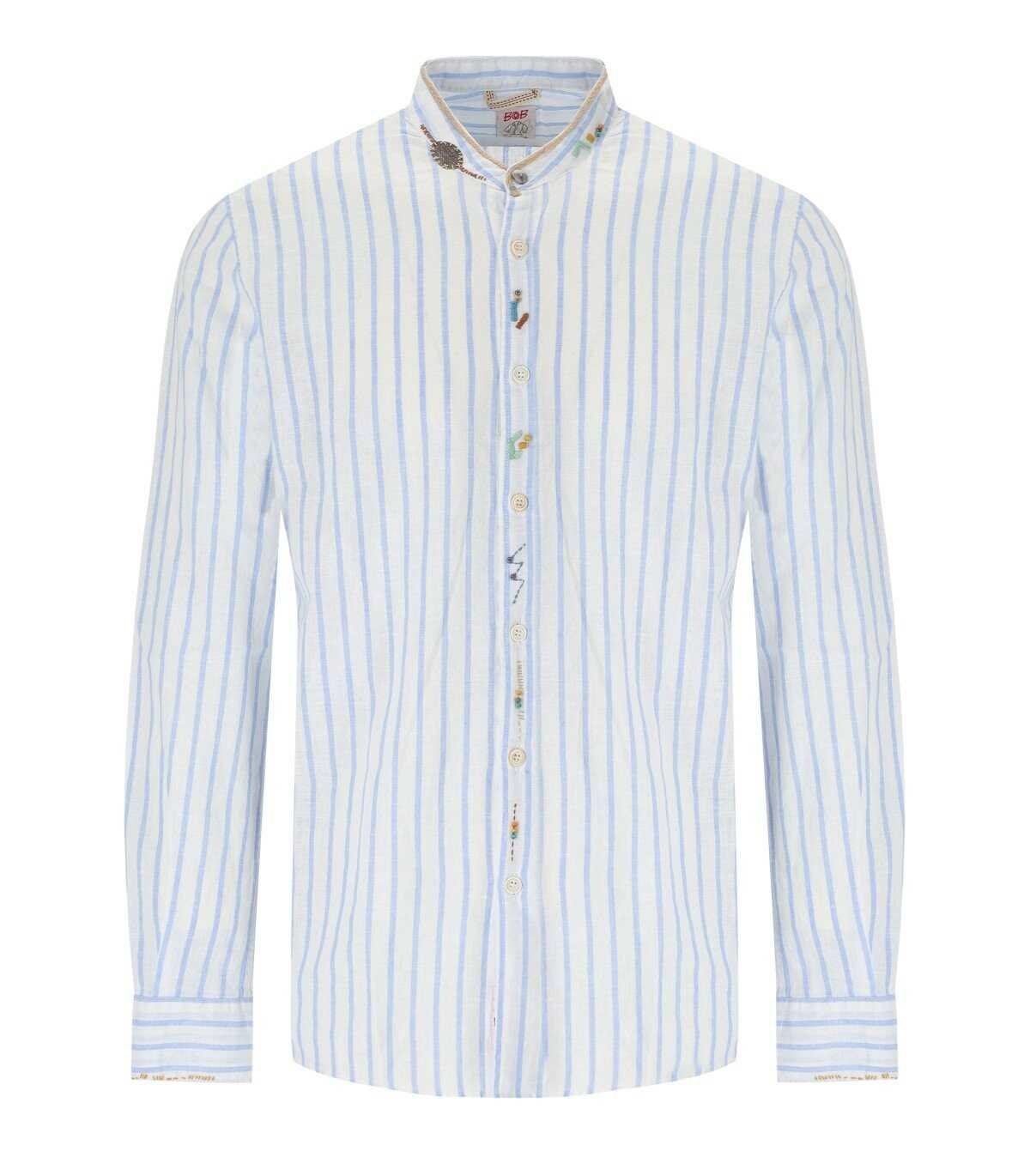 Korea shirt by Bob made of linen and cotton in white tones, with a vertical blue striped pattern. Mandarin collar embellished with multicolored embroidery and beads. Slim fit.