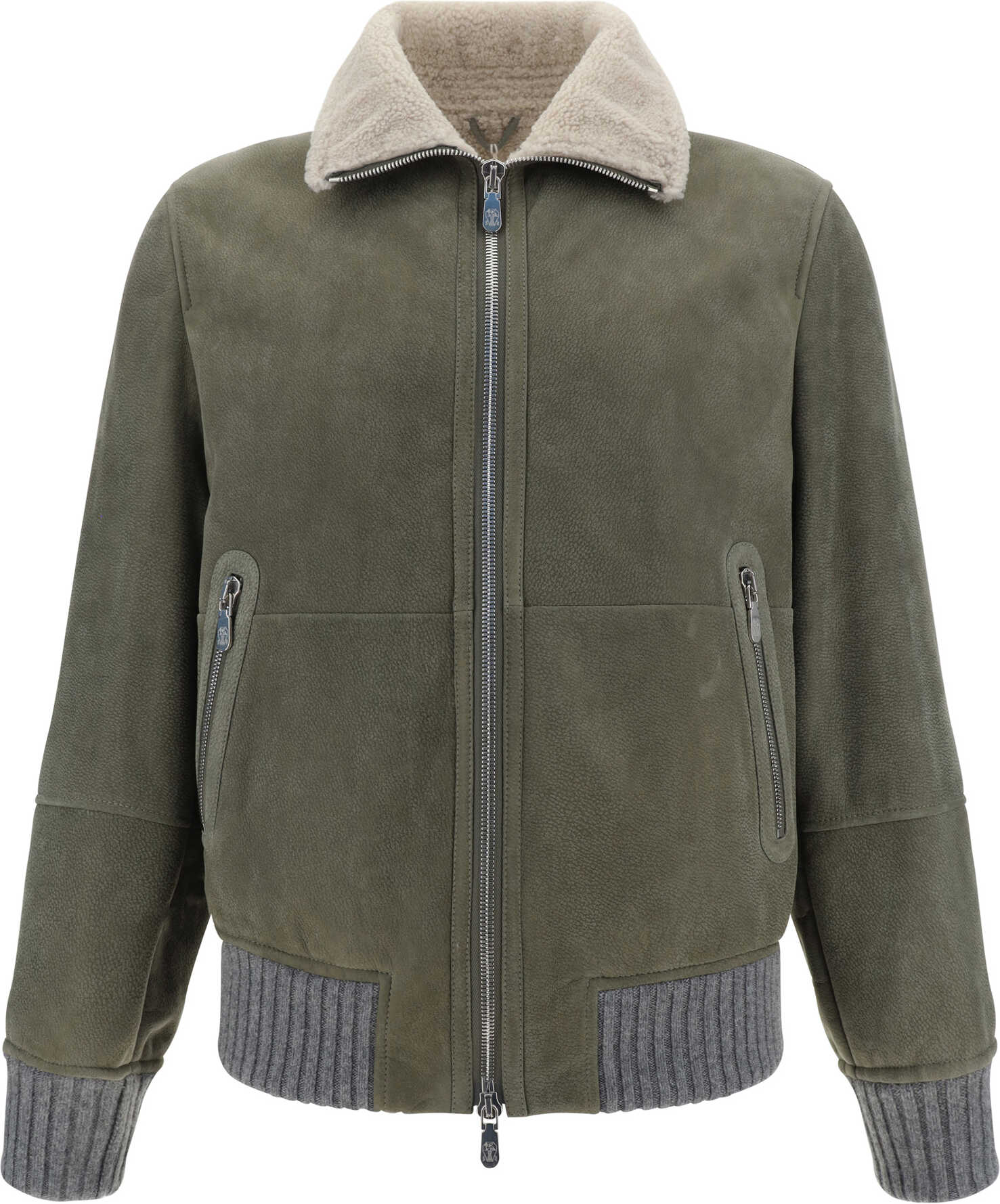 Leather Jacket by Brunello Cucinelli, suede leather design, high collar, front closure by double-slider zipper, two side zipper welt pockets, ribbed cuffs, ribbed hem, shearling interior, regular fit.