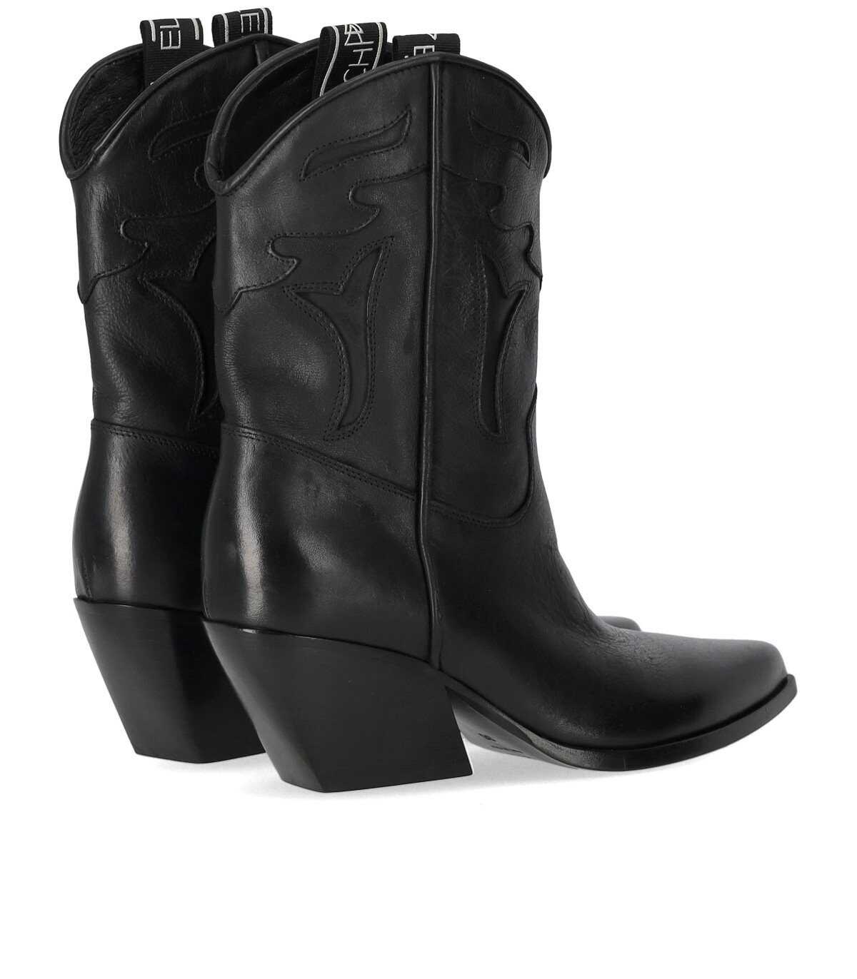 Elena Iachi cowboy ankle boot made of black leather. Fabric details with contrasting logo, pointed toe, and leather interior. Leather sole, heel height 7 cm.