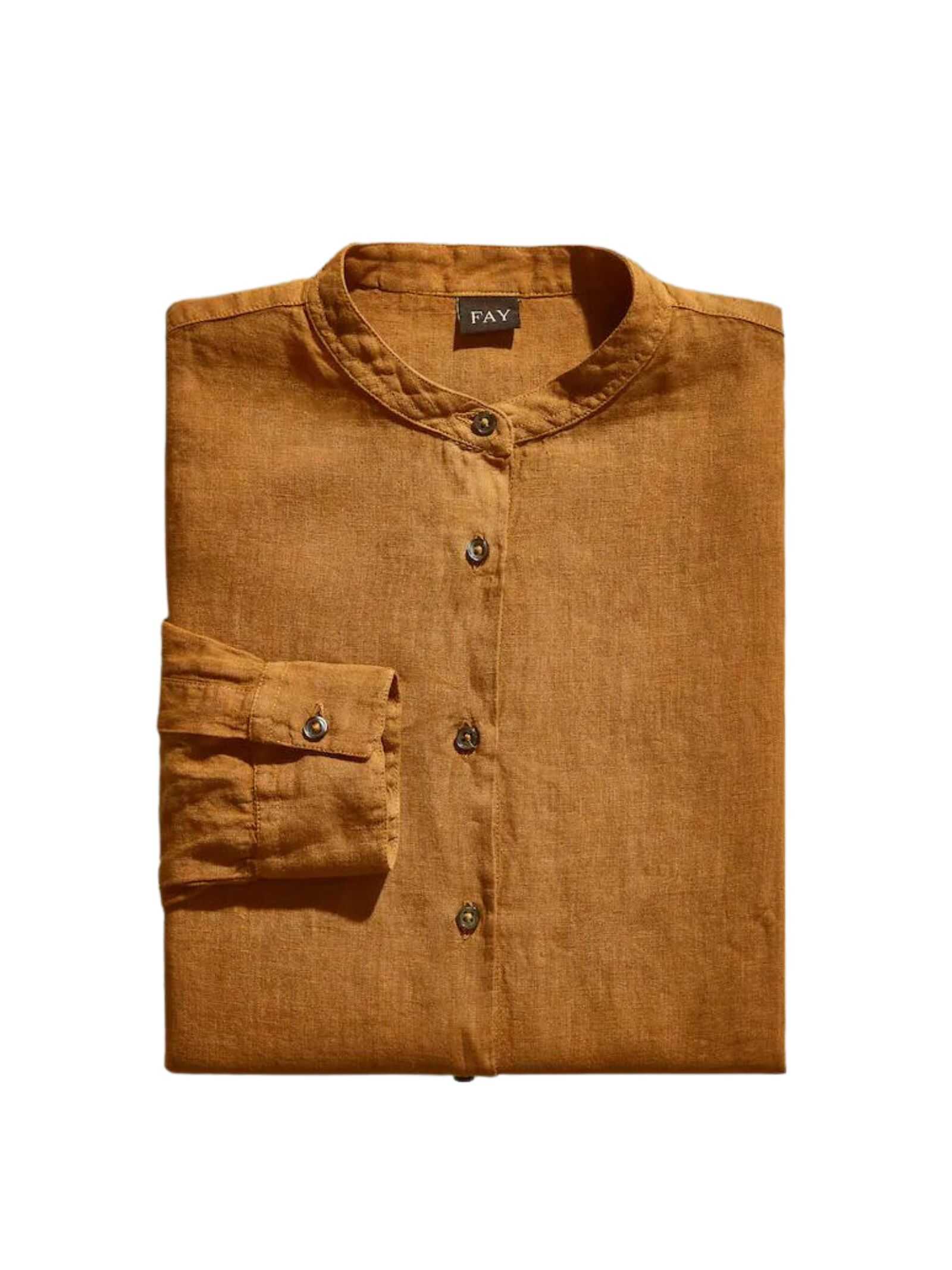 Elevate your wardrobe with the Fay Brown Shirt, made of 100% linen. This cap-sleeved shirt features a mandarin collar, rounded hem, and the iconic Fay logo embroidery. The buttoned front closure adds a classic touch to this timeless casual garment. Perfect for any occasion, this shirt is a must-have for any fashion-forward woman. Get yours today!