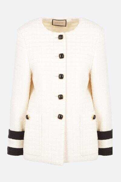 Gucci's single-breasted jacket crafted in white tweed. Featuring crew neck, button closure, long sleeves with striped turn-up at cuffs, front pockets, straight hem and lined interior.
