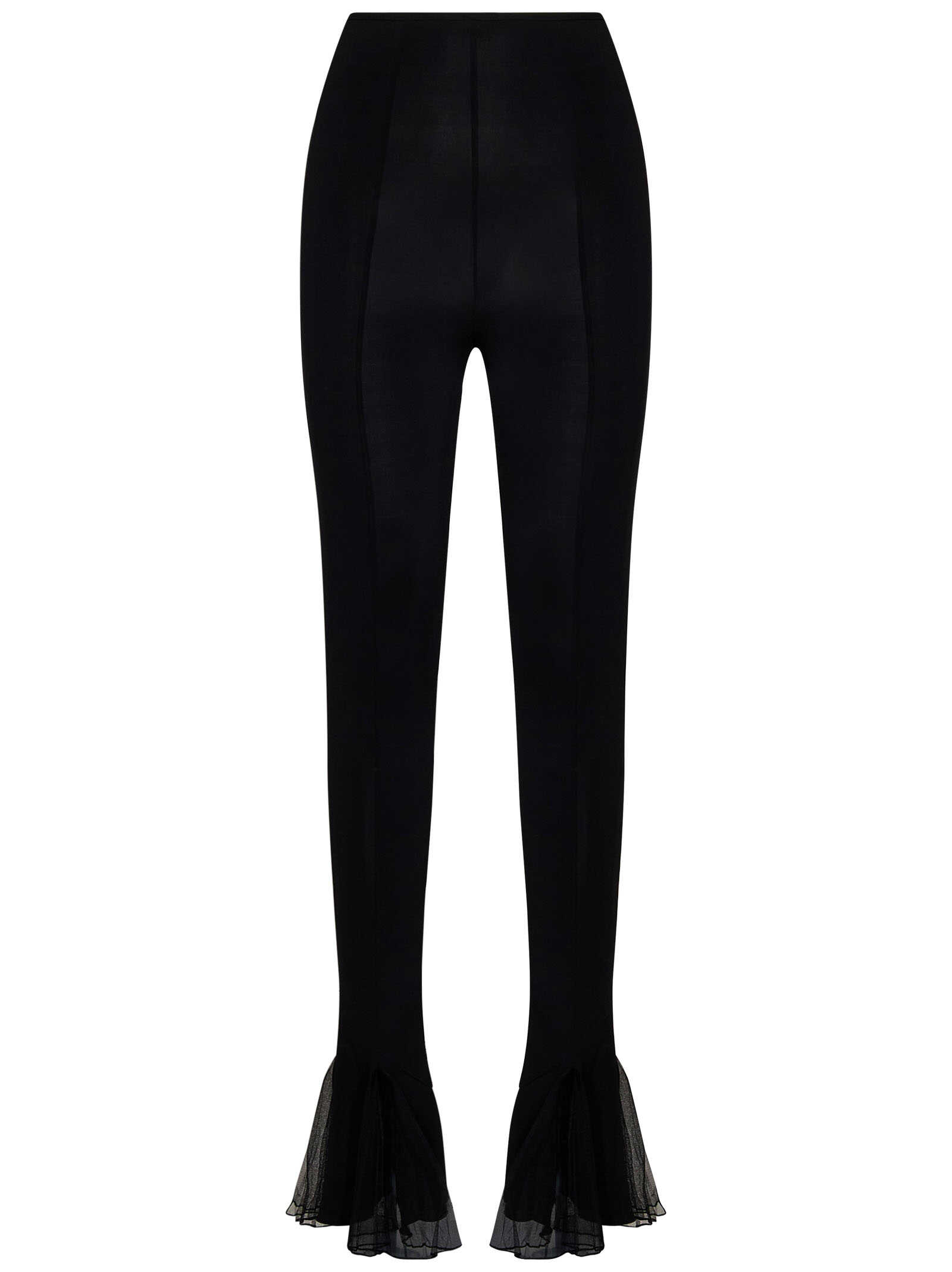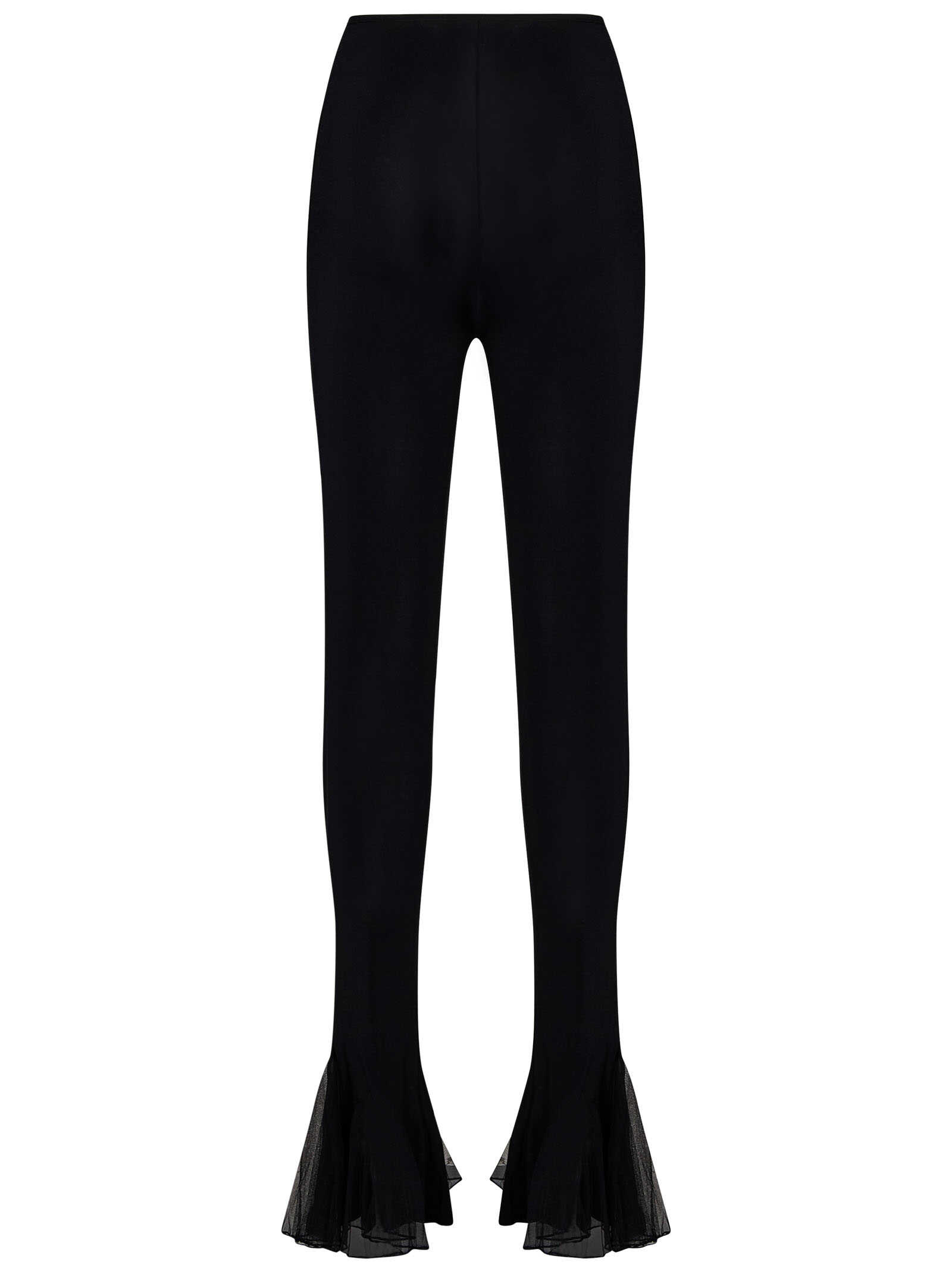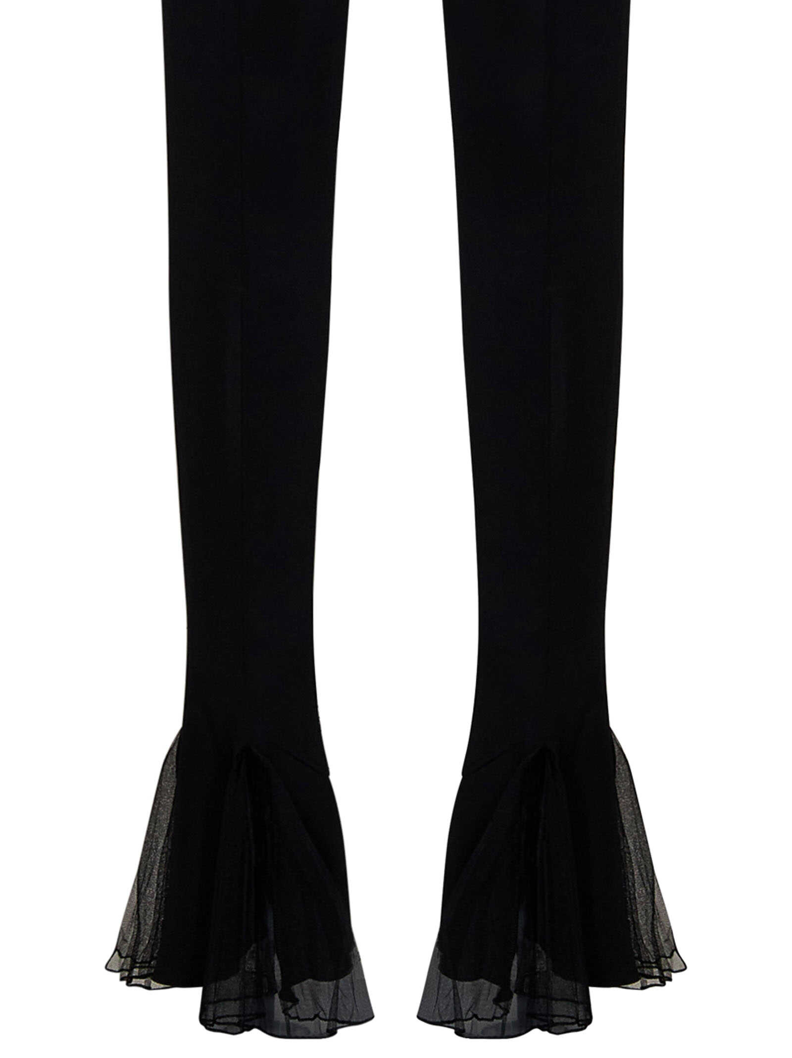 Black stretch viscose jersey skinny trousers with transparent tulle ruffles at hem.
