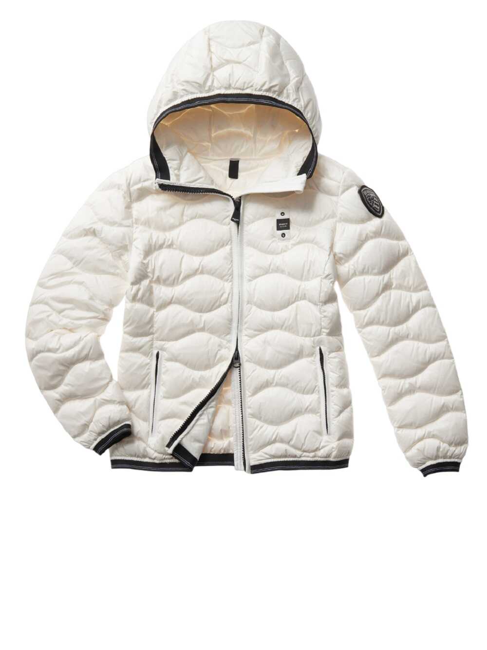 Nylon down jacket padded with down and quilted with horizontal waves with fixed hood. Classic warm but not bulky padding. Central closure with double slider zip, slider cover on the neck and internal zip guard for protection. Two front pockets with hidden vertical zip and one with velcro on the inside on the left. Color matched herringbone tape profile to hide the zips, both the central one and those on the pockets. Striped elastic tape on the cuffs and waistline for a tighter effect. Characteristic Blauer loop sewn on the left chest and detachable Blauer patch with Swarovski decoration on the left sleeve. 100% nylon down jacket with 90/10 feather padding, 165 g.