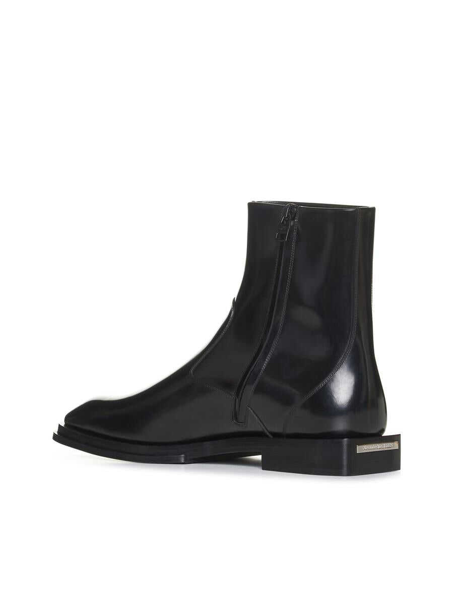 Alexander McQueen’s black brushed leather ankle boots featuring a tapered toe, side zip fastening and leather sole with low square heel and silver-tone metal lettering logo plaque.