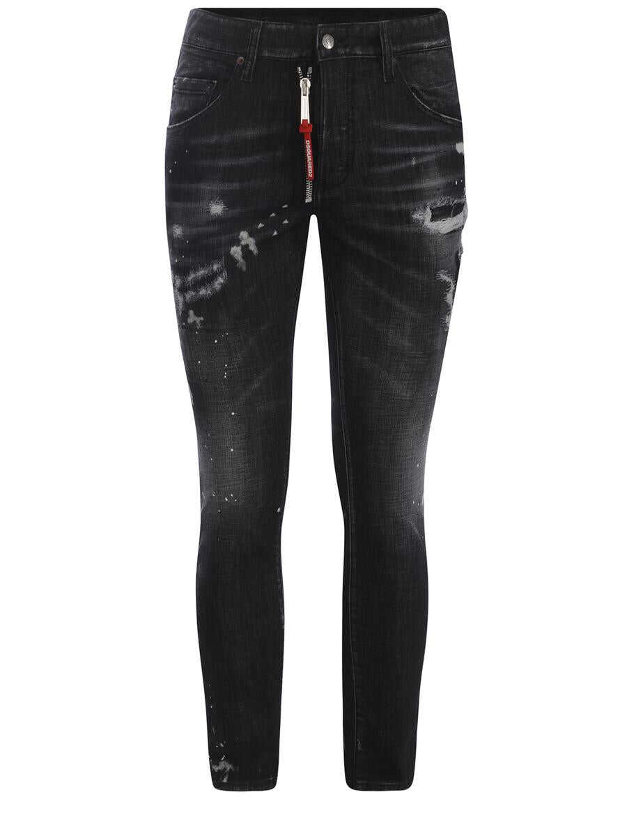 Jeans Dsquared2 "Skater" made of Black denim. Stone wash effect. Contrasting paint splashes all-over White. Breaks and patches. Button and zip closure. Metal zip detail and logoed pull, contrasting Red. Black leather label, contrasting White logo lettering applied on the back. Skater fit.