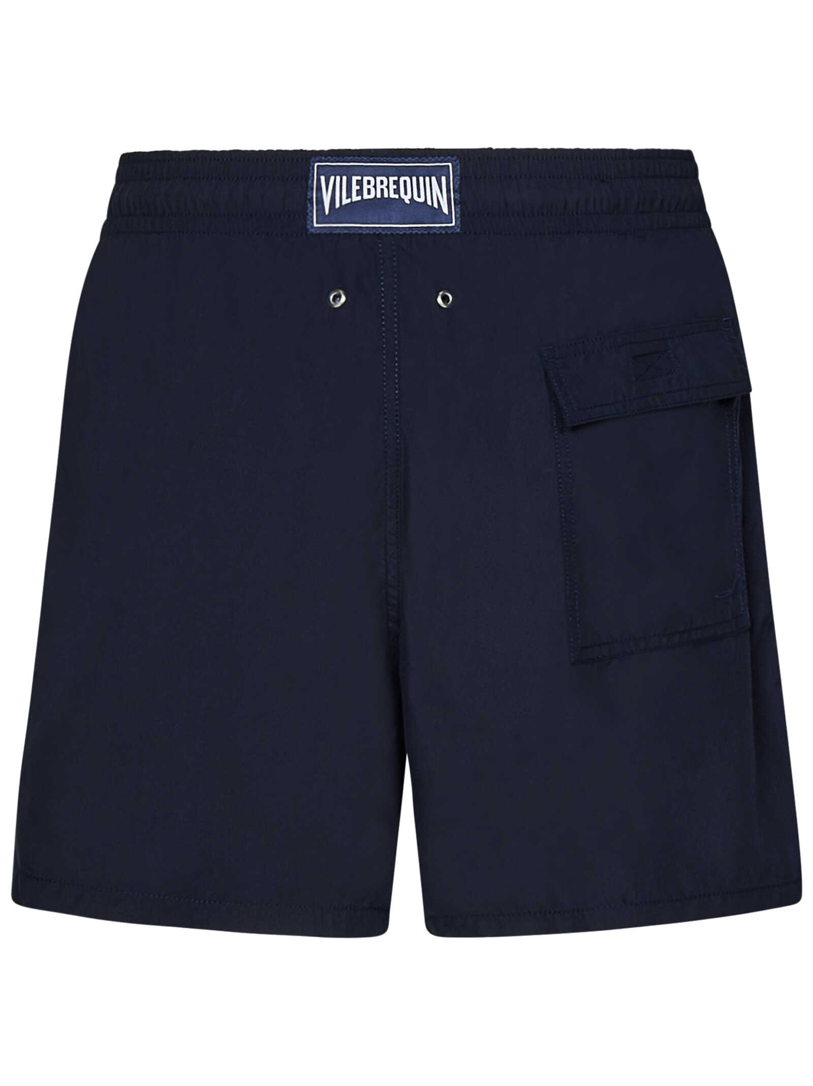 Moorea marine blue velvet-effect twill swim shorts with logo label at back.