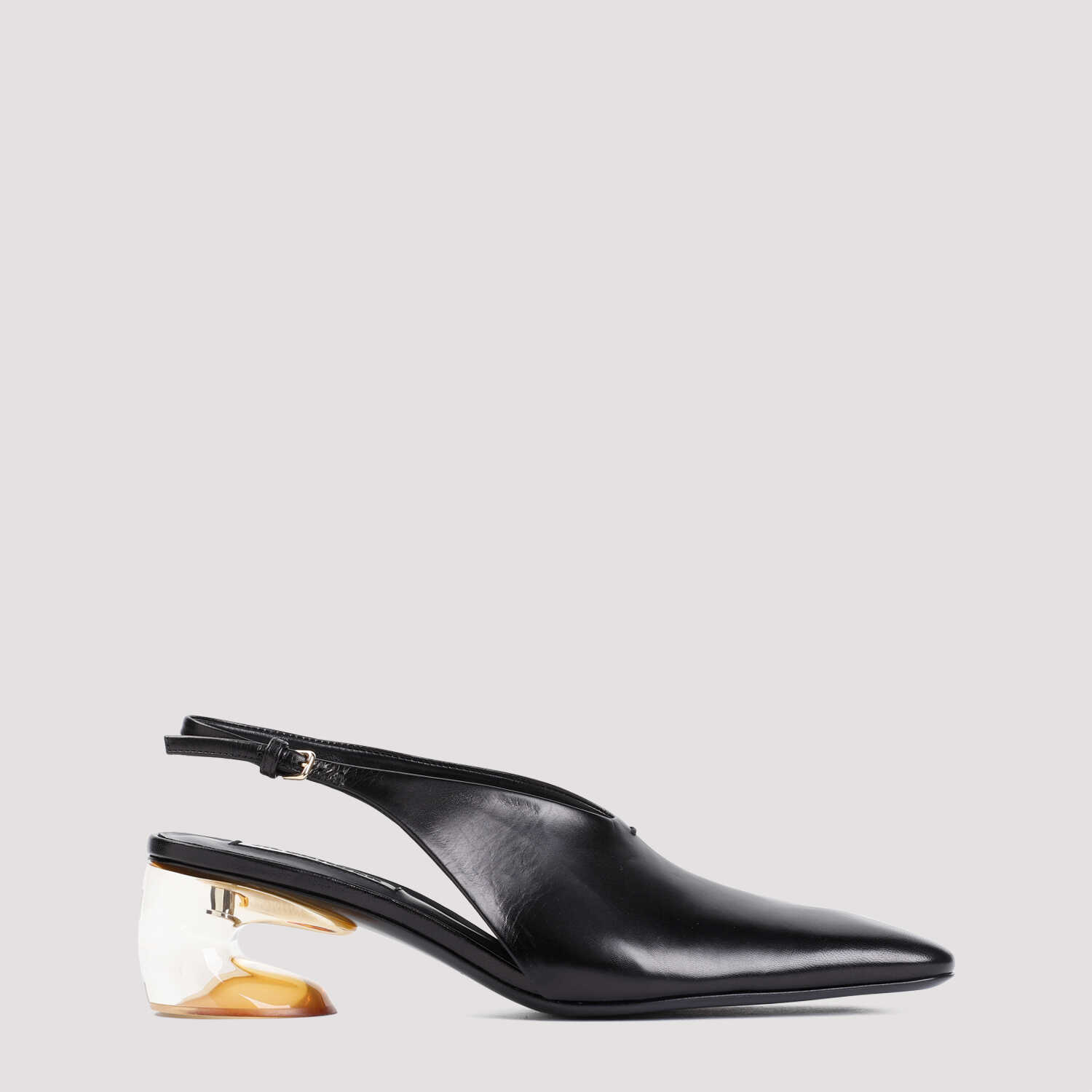 Jil Sander Black Goat Leather Pump. Pure black goat leather pump, squared pointed toe, v-cut upper, adjustable ankle strap, transparent plexiglass heel, tonal sole.