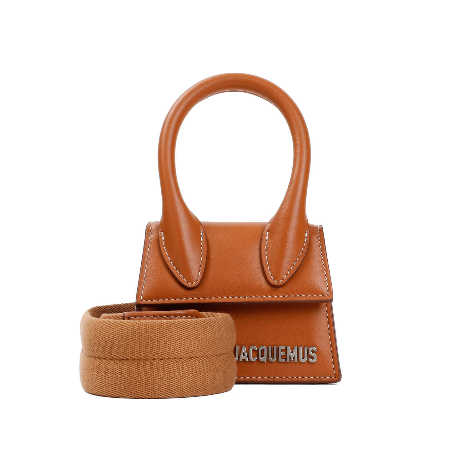 Jacquemus Light Brown Leather Le Chiquito Homme Bag. Light Brown Leather, tonal reinforced handle on top, magnetic flap fastening. Long removable tonal cotton strap with leather inserts. Engraved lobster clip, silver logo hardware, fully lined.