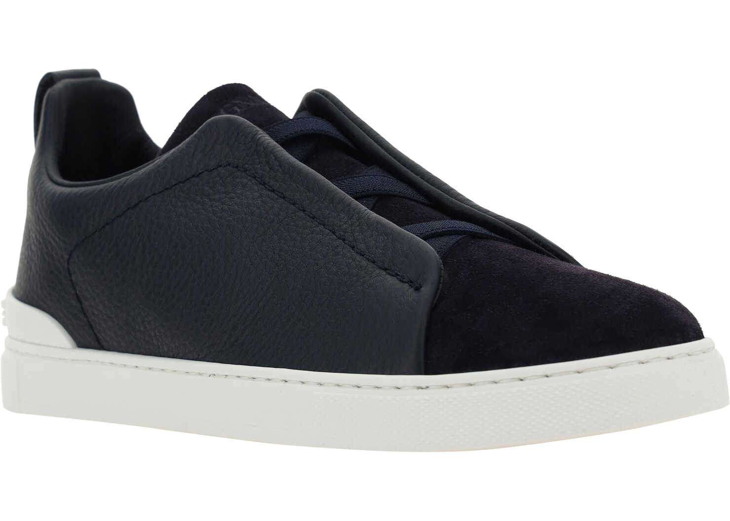 Calfskin Low Top Sneakers by Zegna, suede design on toe and back of foot, flat sole, slip-on style, press-on logo insole.