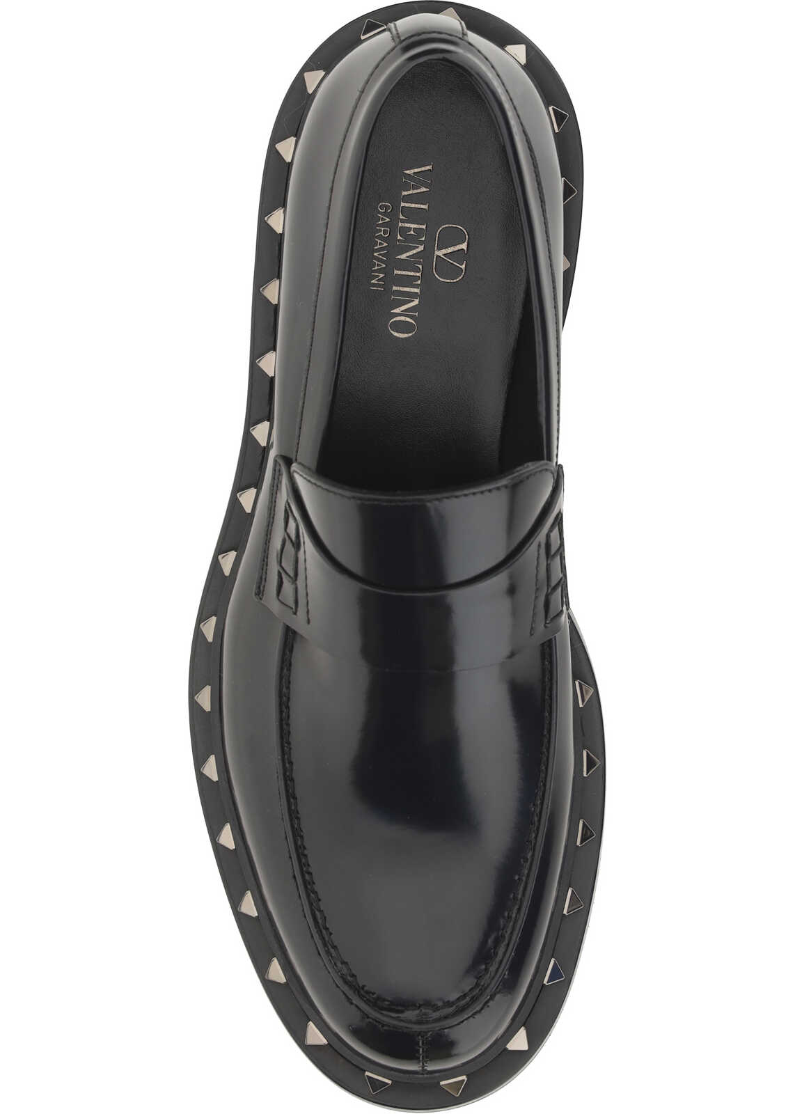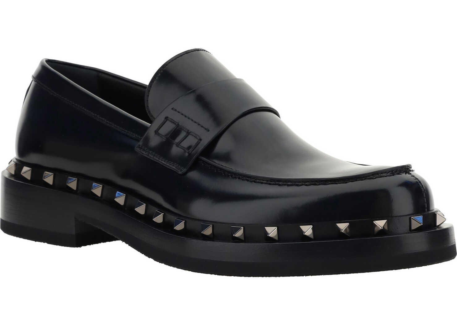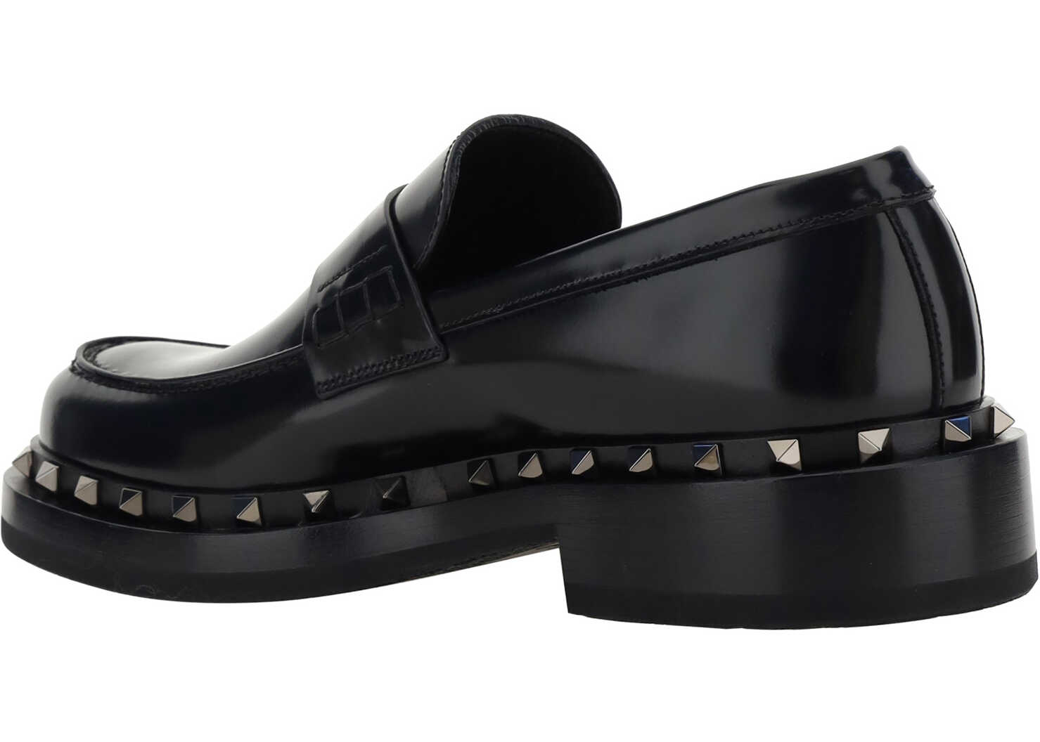 Calfskin Rockstud M-Way Loafers by Valentino Garavani, slightly elongated round toe, block heel, iconic Rockstud studs applied in contrasting perimeter of sole, contrasting press-studded logo insole.