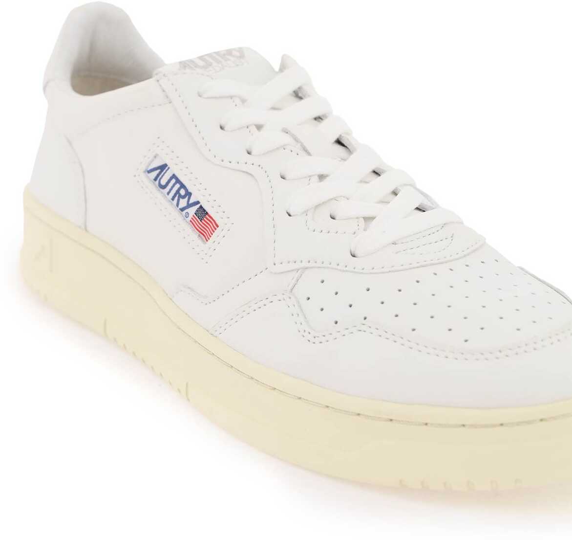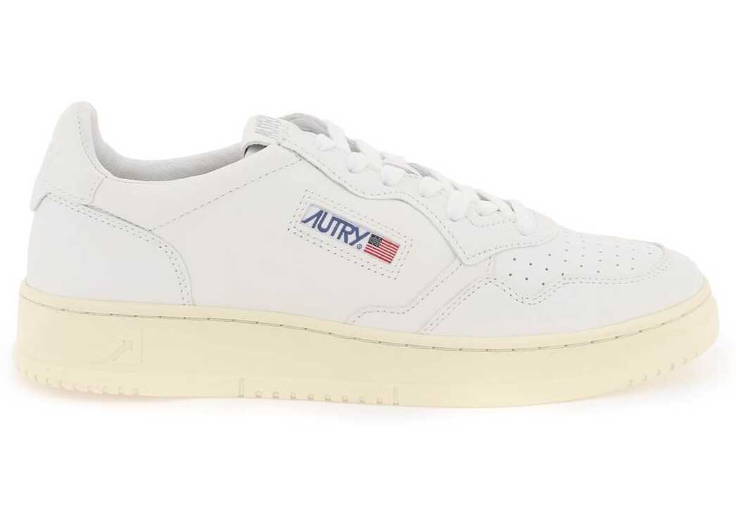 AUTRY Medalist Low sneakers crafted in soft goat leather with perforated toe, debossed logo on the heel tab, side logoed fabric inlay and logo embroidery on the tongue. Lace-up closure with cotton laces, leather and terry lining, removable leather insole, rubber sole with side embossed logo.